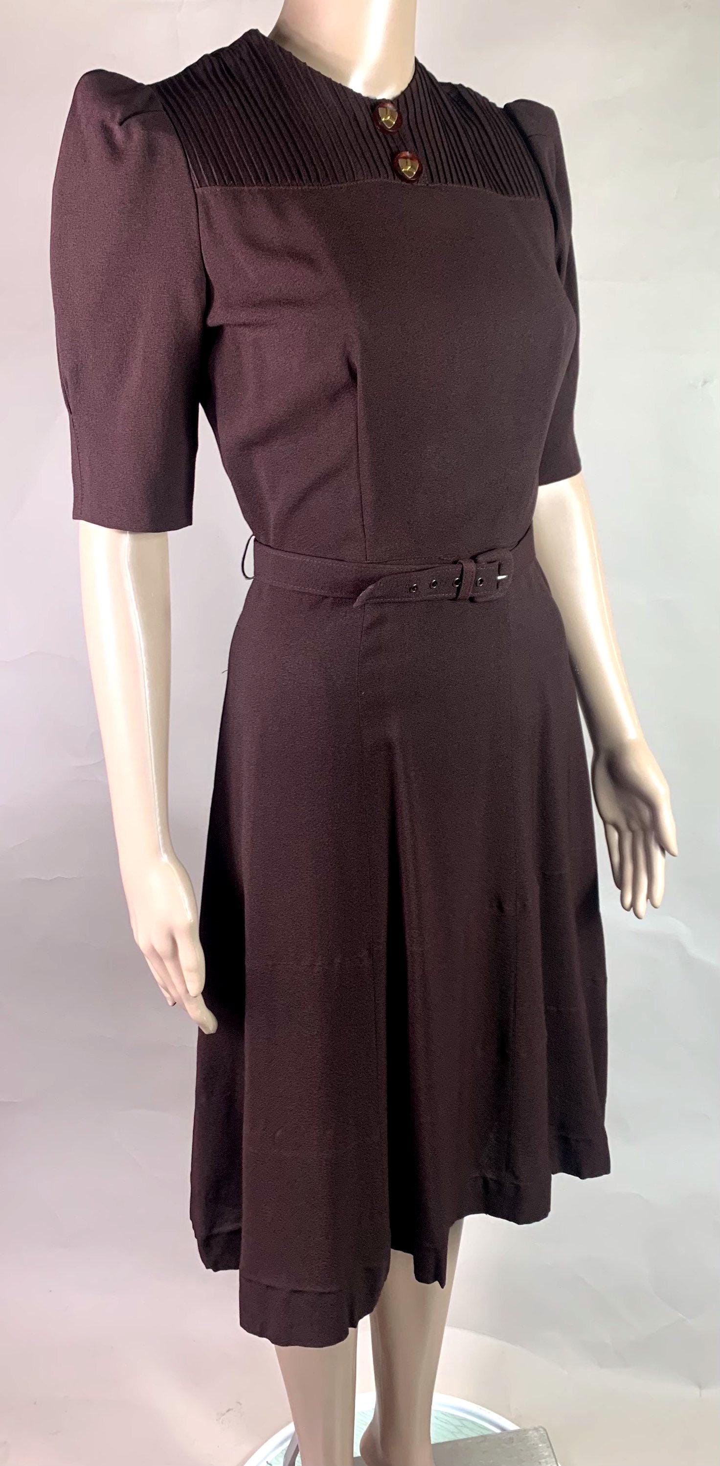 Stunning early 40s crepe dress in MINT condition! As simple as it is it has lovely details. The label says “Apex Advanced Modes,” “Clothes USA,” “Nation Wide,” and “Style Service.” There are 5 tiny figures with writing under them but all I can make out is “dress” and “office.” Cute!