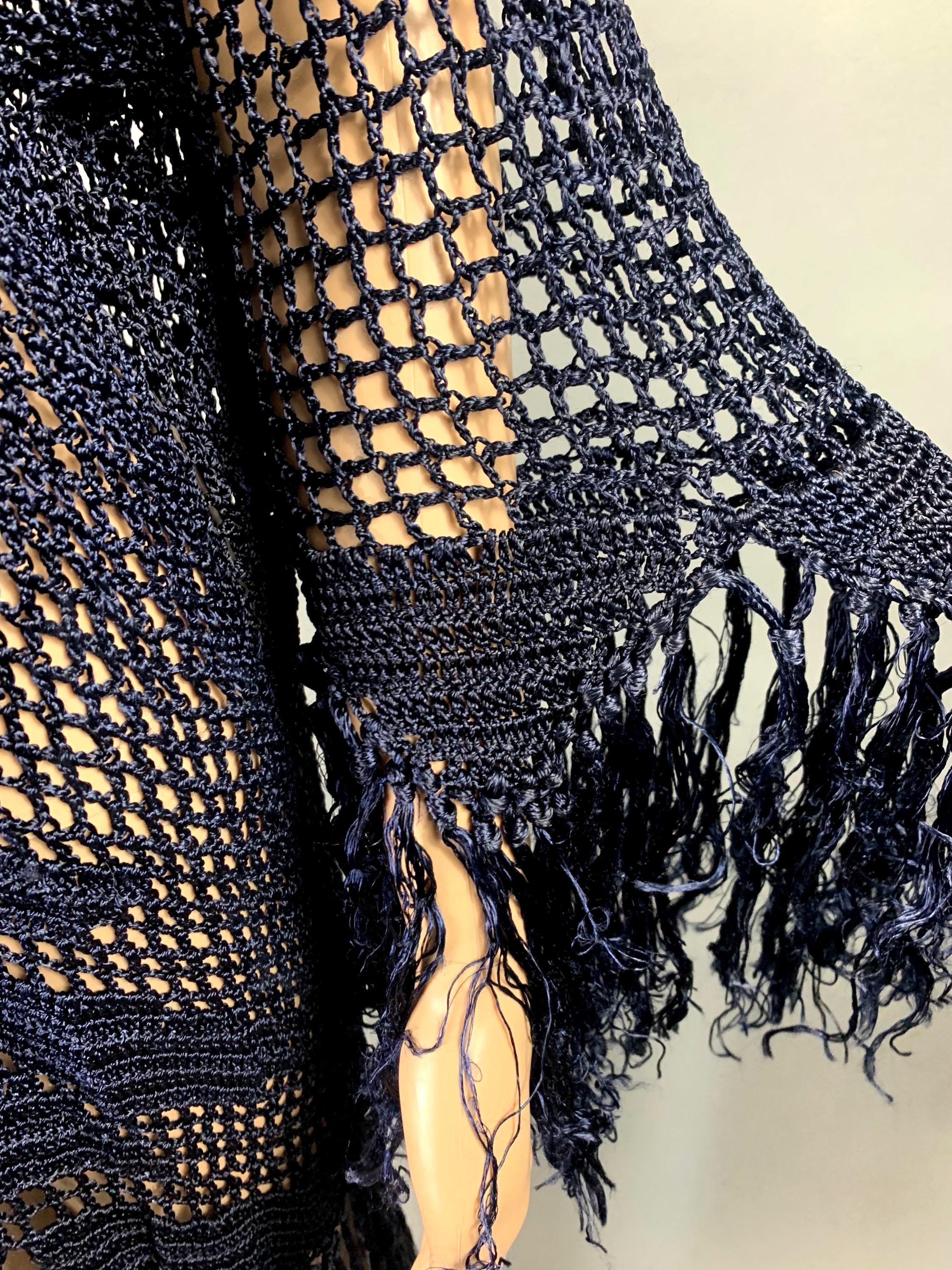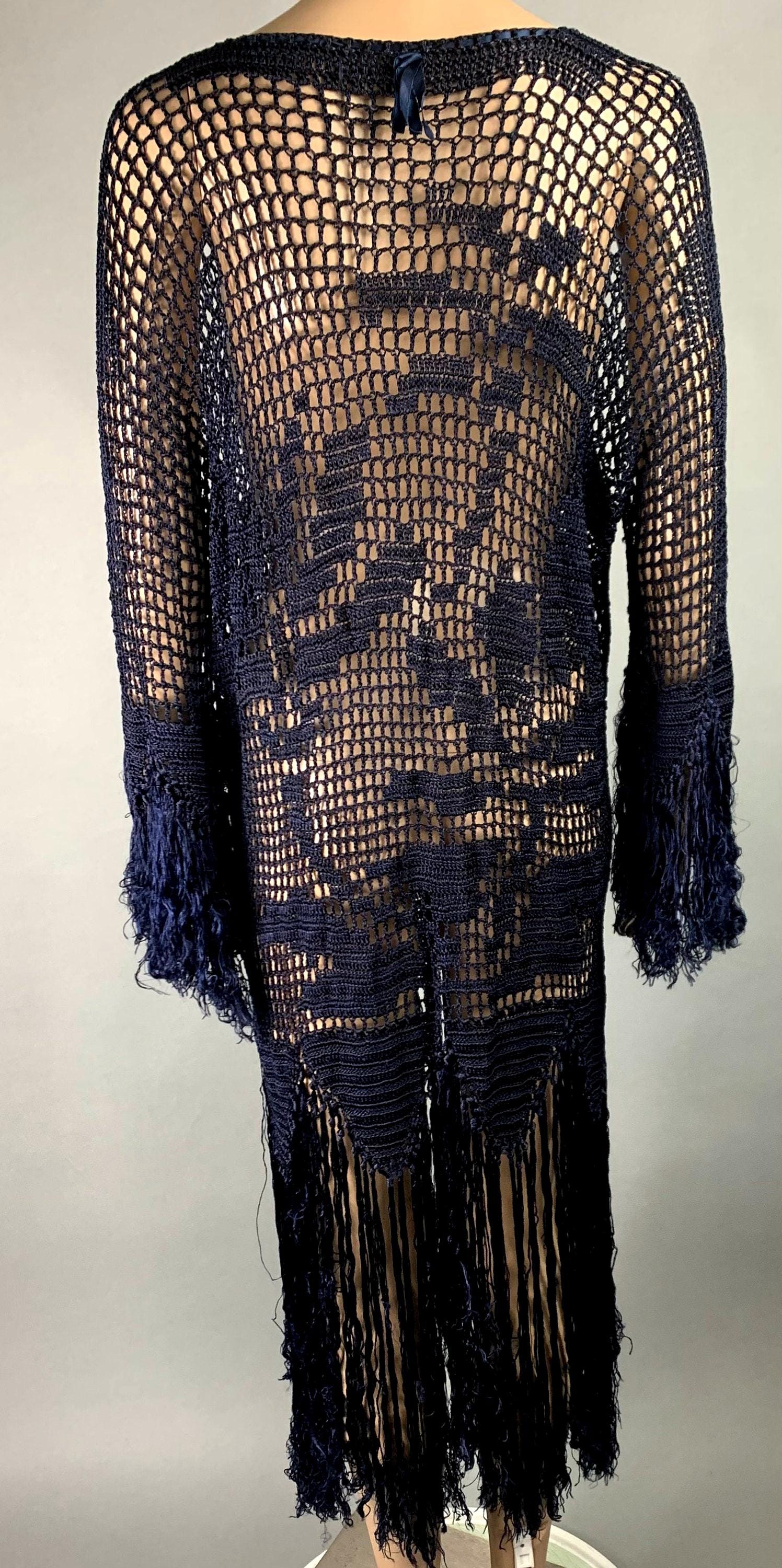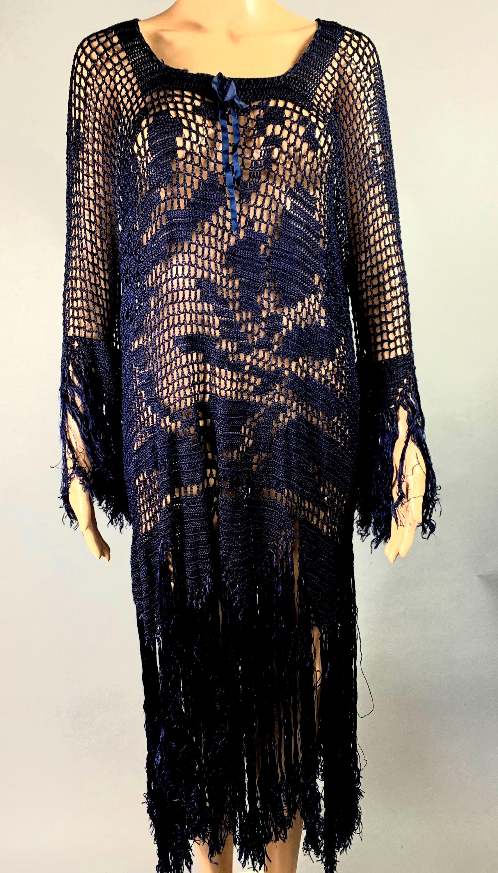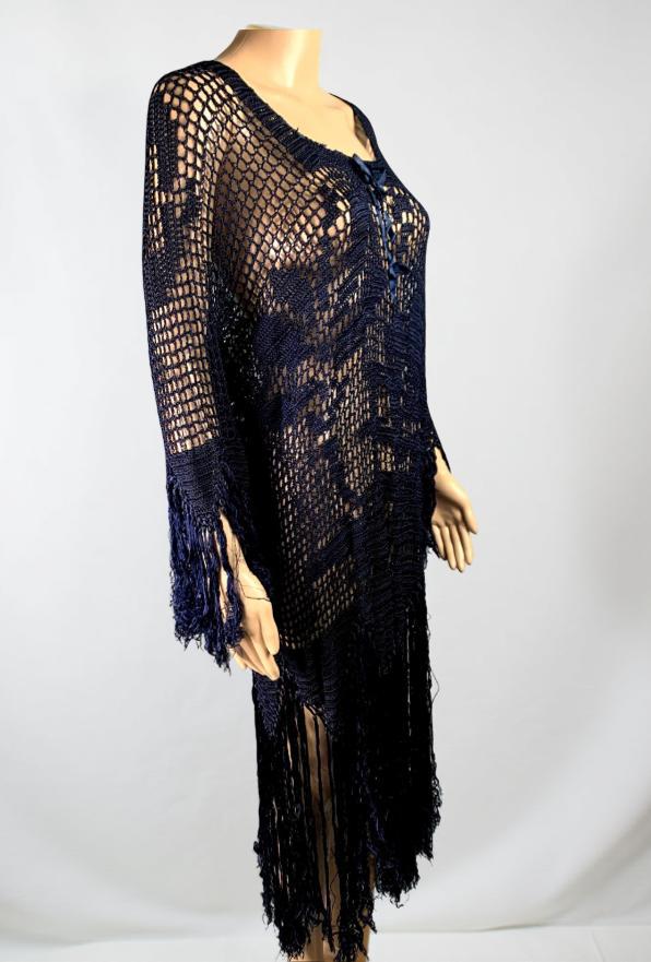 flowers. The sleeves have inverted “Vs” at the wrists. Lots of fringe on sleeves and bottom of piece.