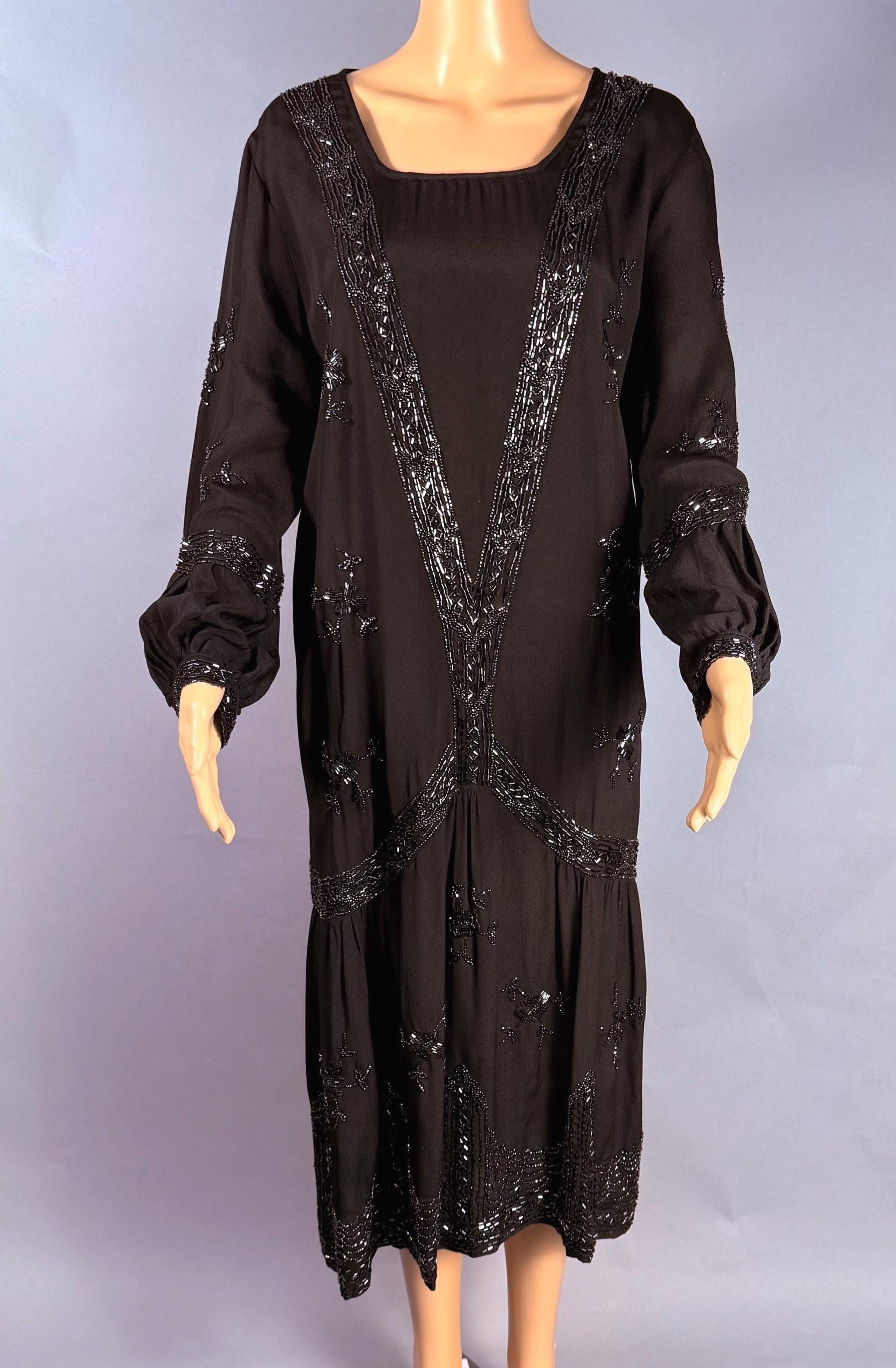 Beautiful vintage black beaded dress from the 1920s. Hand beaded with beaded sash in the back. The fabric is a silk rayon crepe.