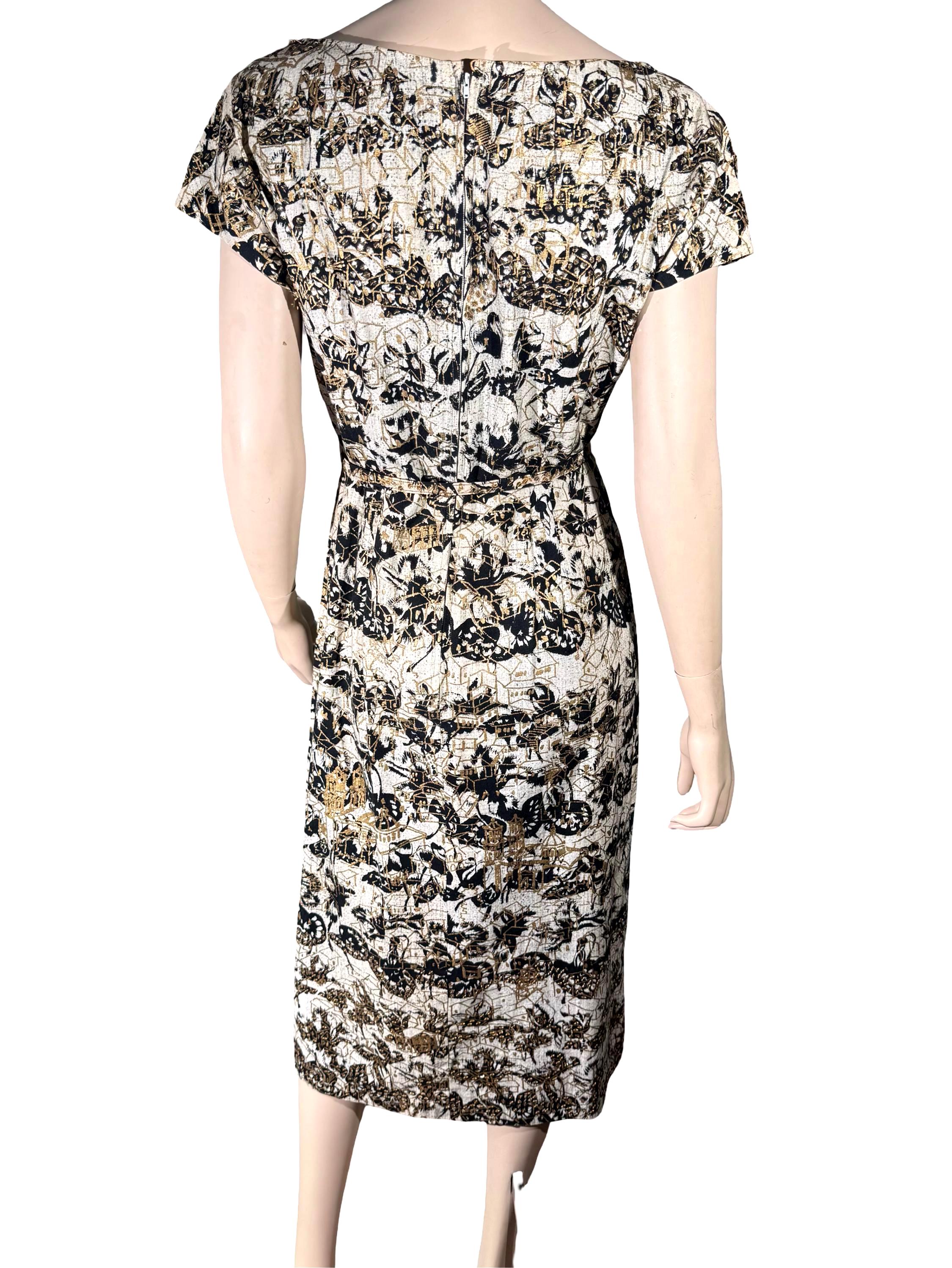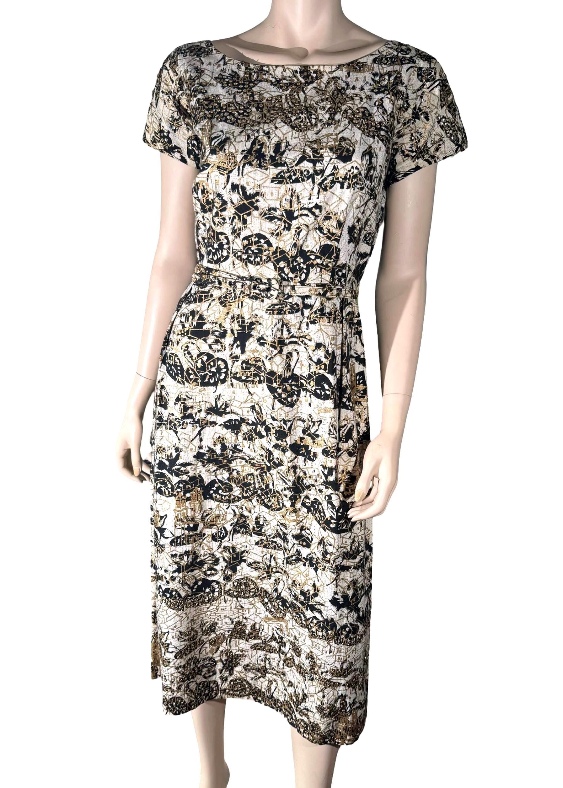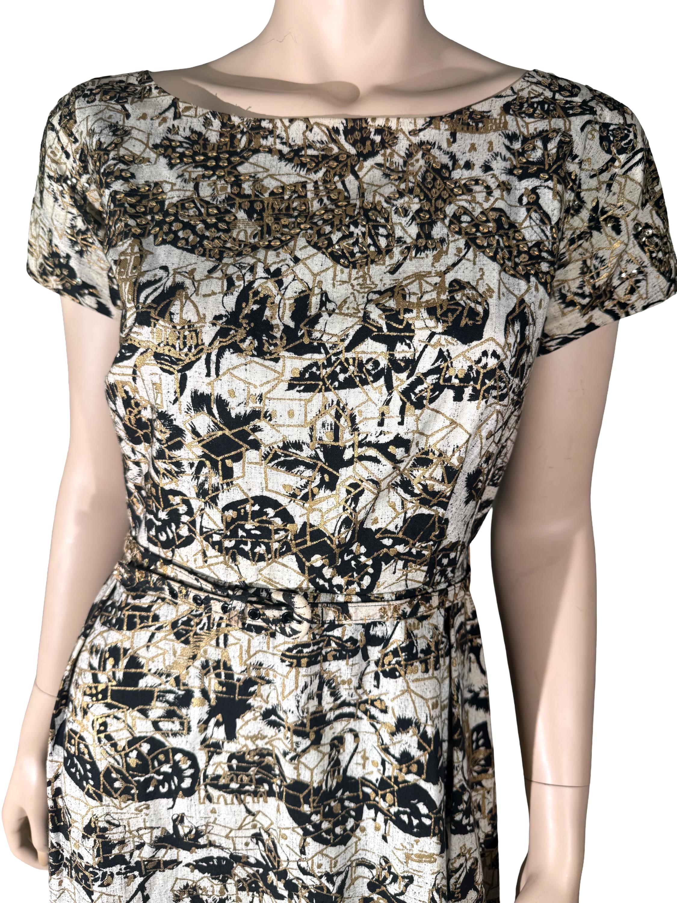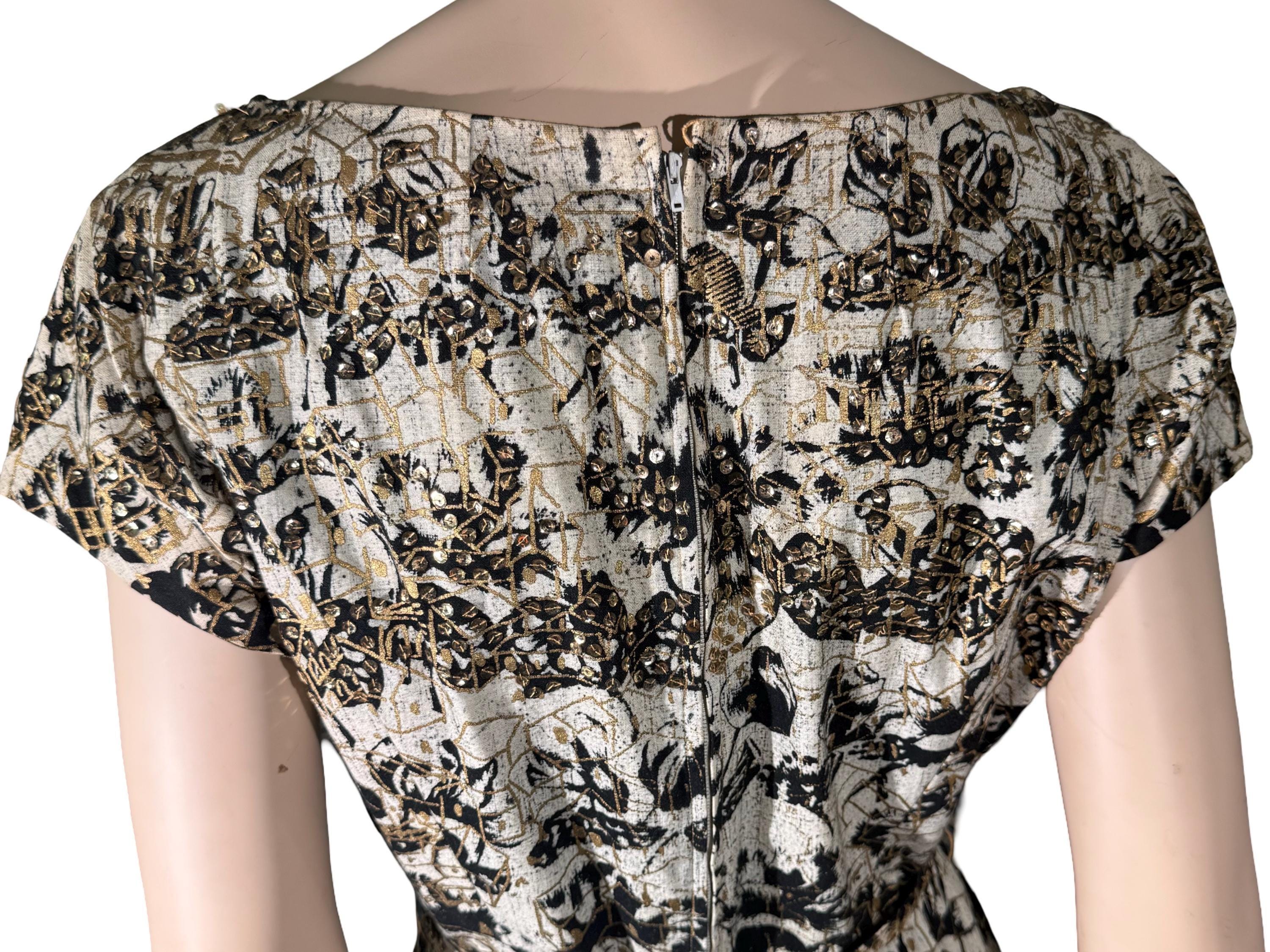 The dress is accented and layered with gold sequins. It has its original belt, which is also in excellent condition.