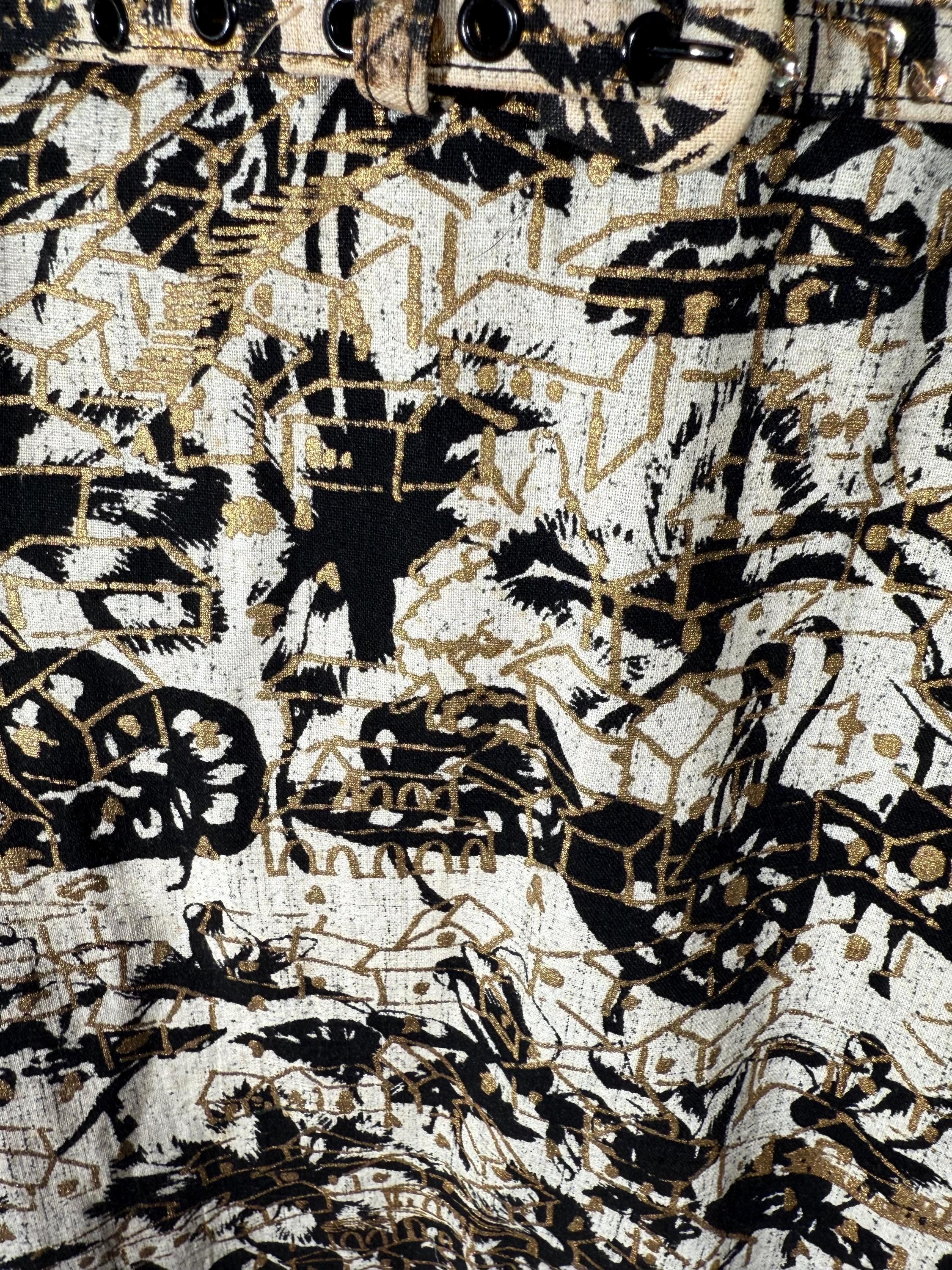 Gorgeous late 1950s/1960s dress with an African style batik print in black, tan, and gold. It is in such amazing condition that it looks and feels brand new!