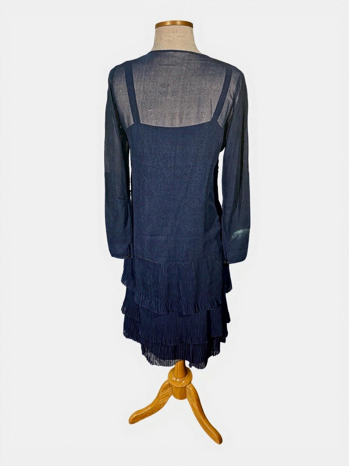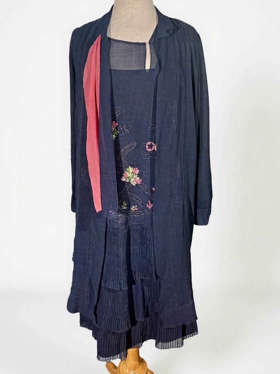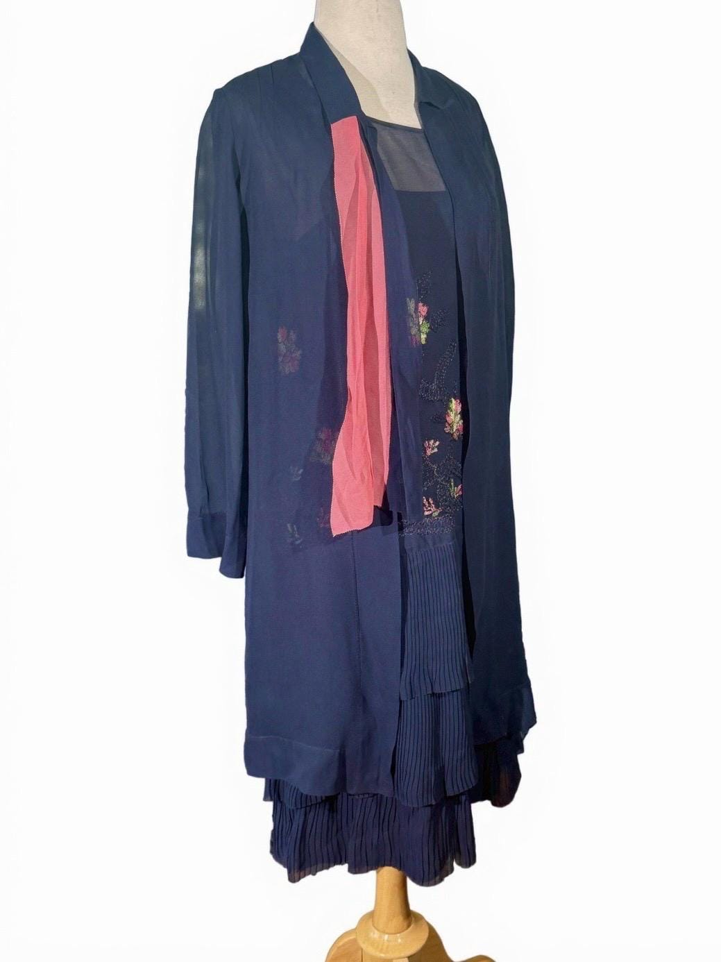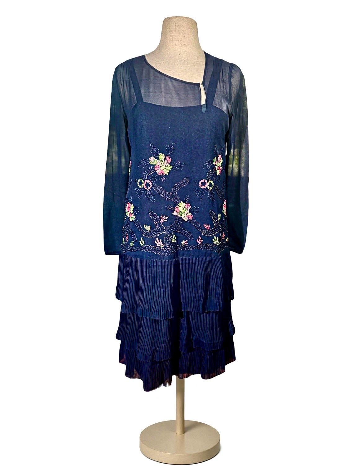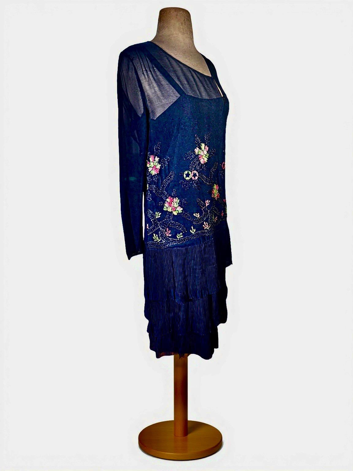 This is a gorgeous navy blue silk chiffon dress has a straight silhouette and a dropped waist. The dress features a knee-length hemline, (considered scandalous at the time) and is adorned with floral embroidery in shades of pink, violet, green and fushia.