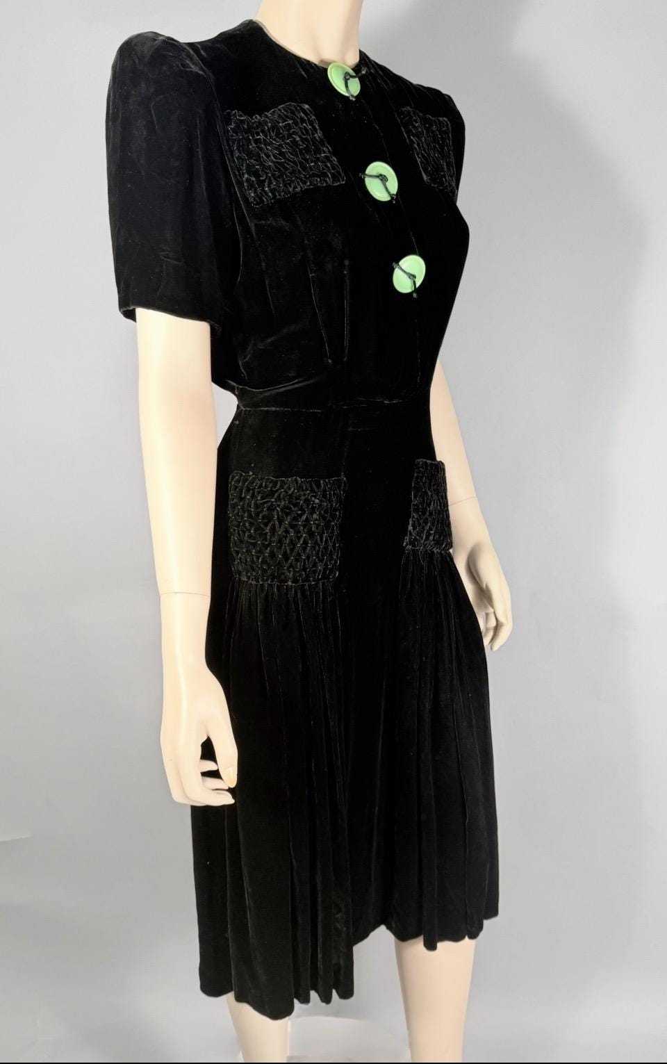 This is a vintage late 1930s, early 1940s black velvet dress with short sleeves. It features a round neckline with three decorative, green buttons made of some early plastic. Behind the buttons are snaps which go down the front of the bodice. The buttons have small black ties.