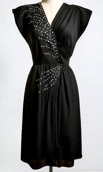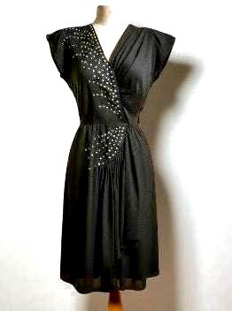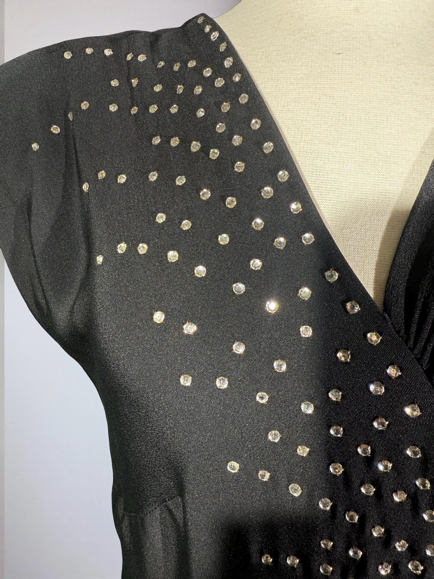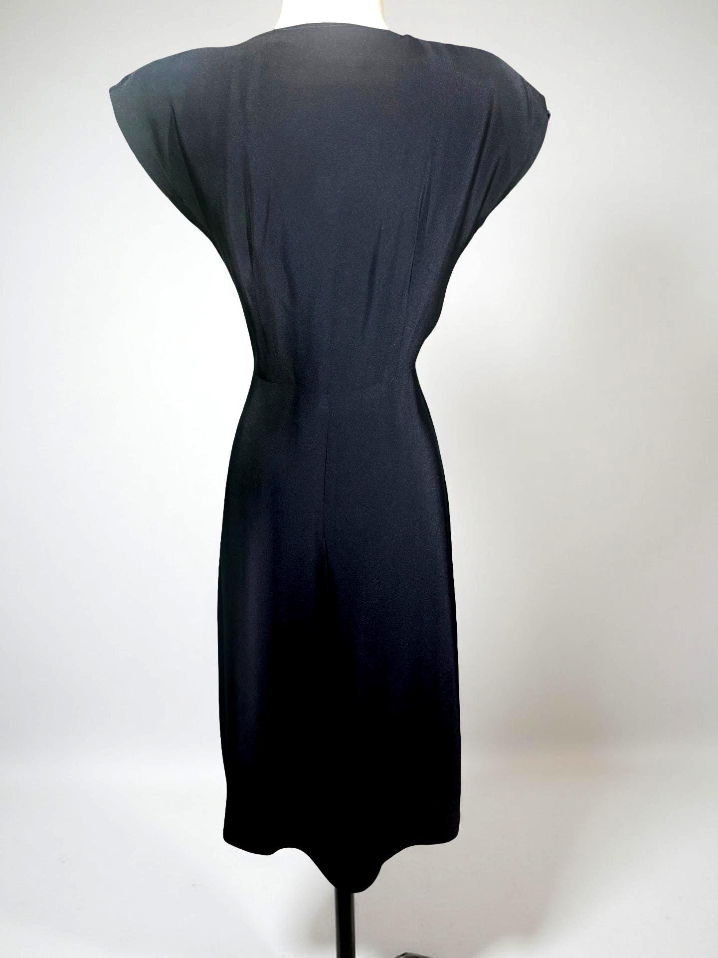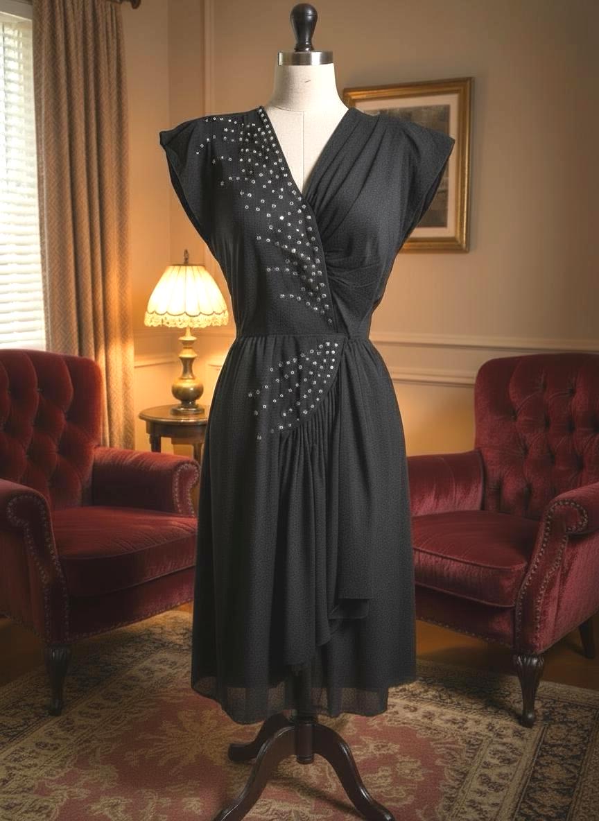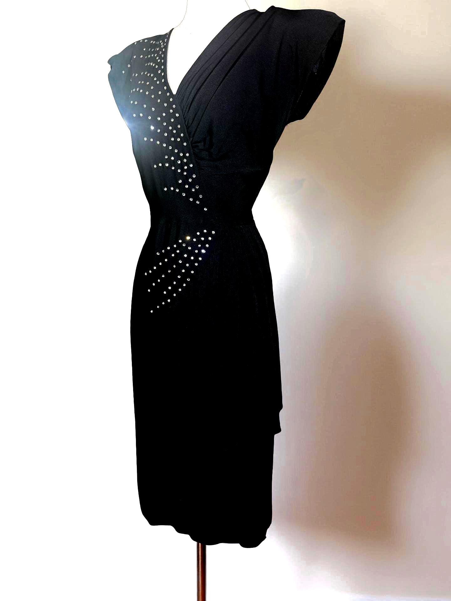 Beautiful vintage black 1940s dress featuring a V-neckline, cap sleeves, and rhinestone embellishments.