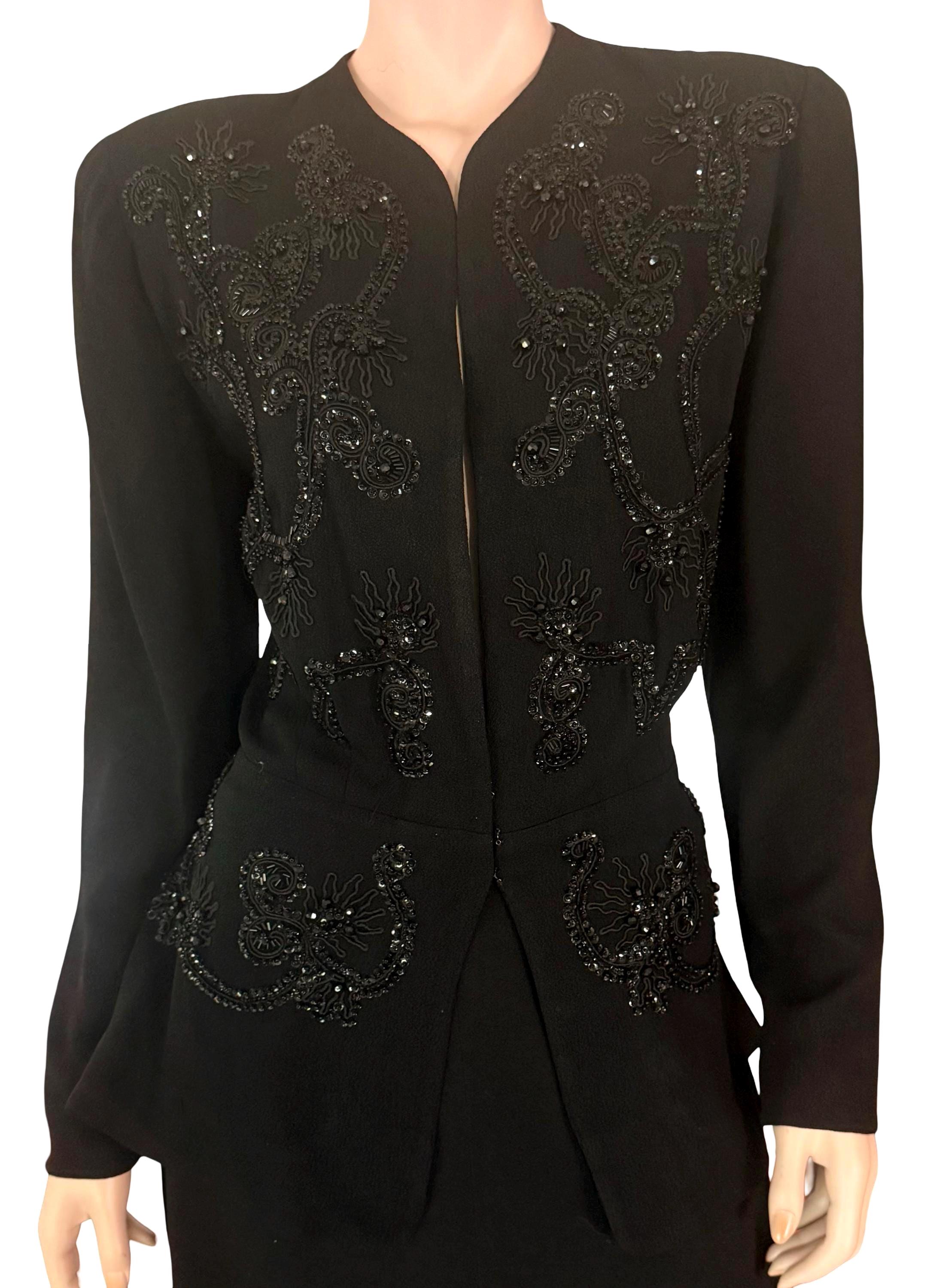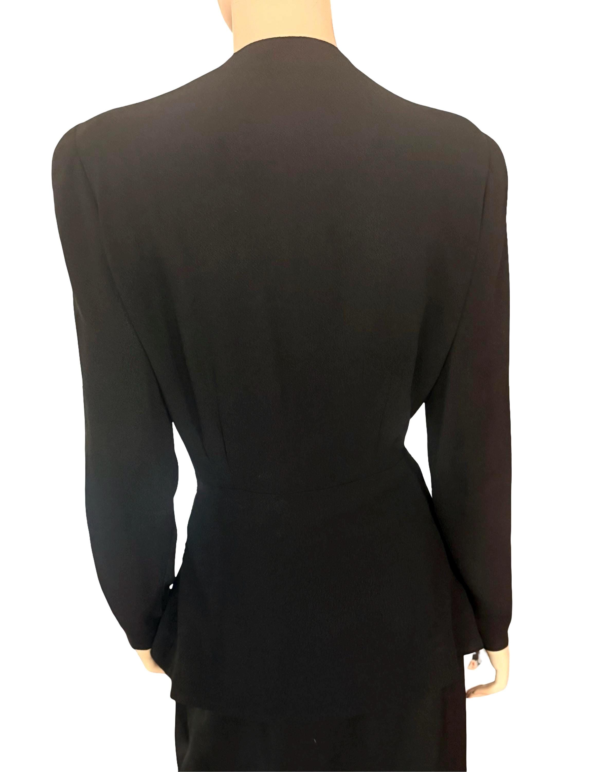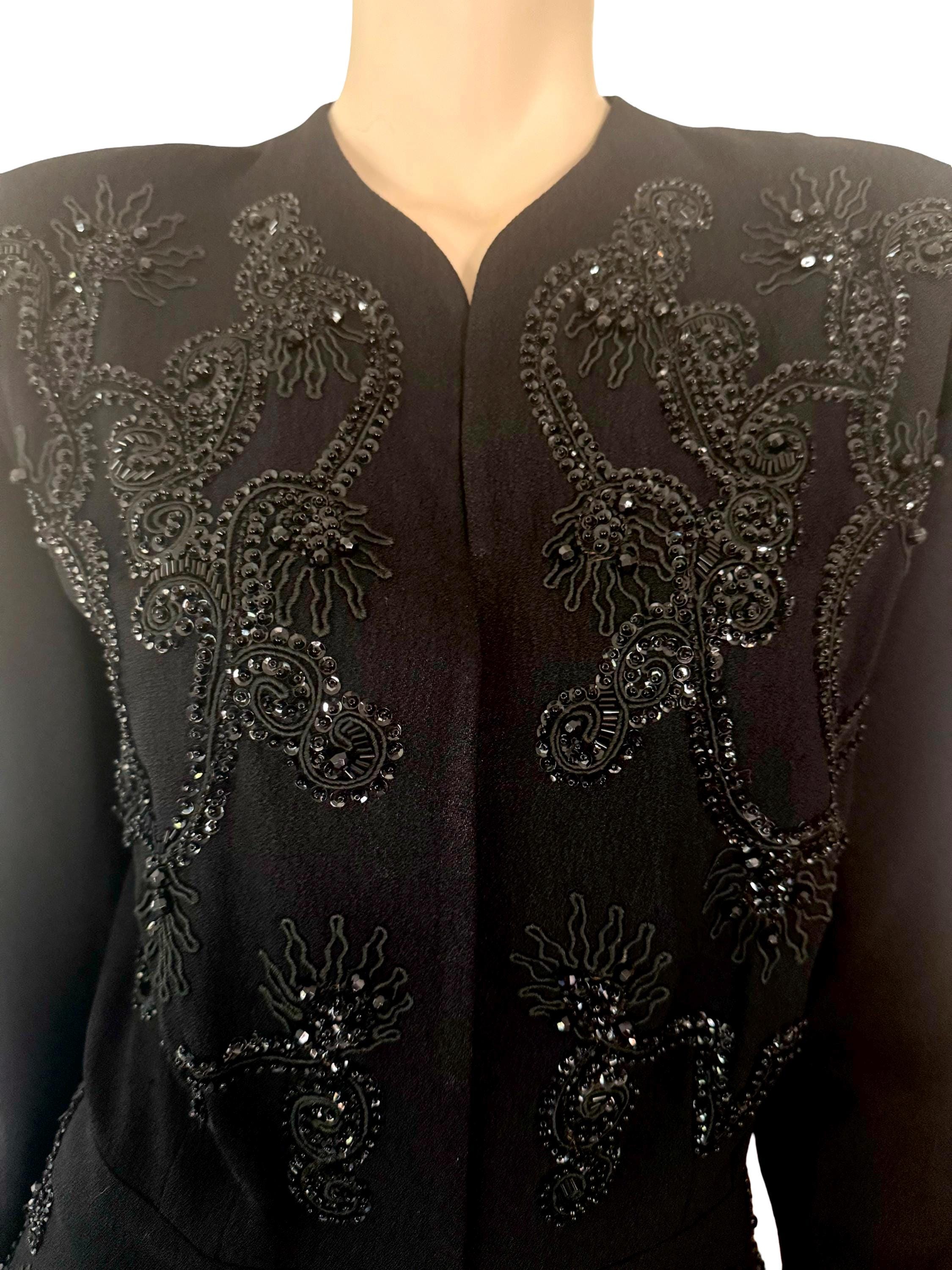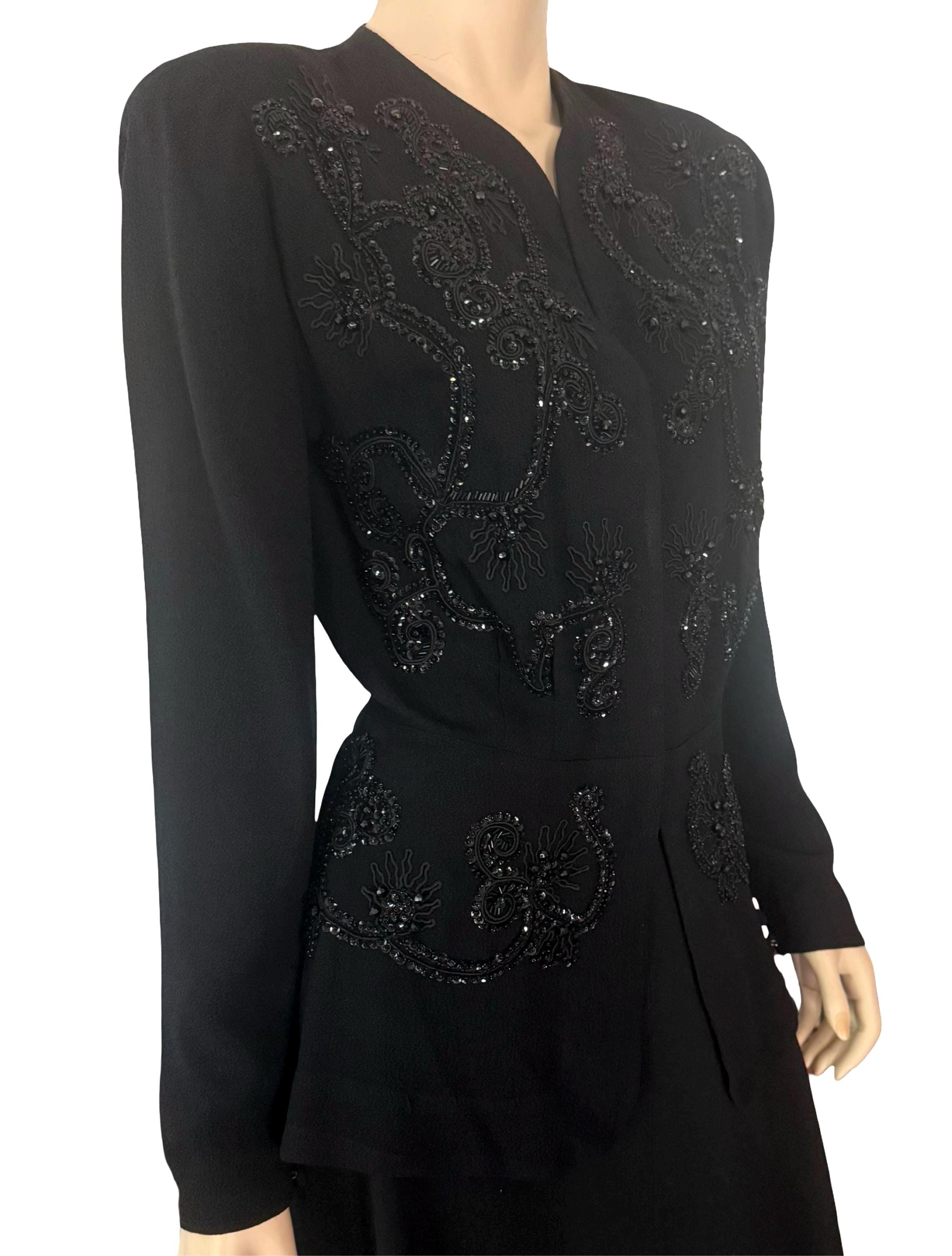 Gorgeous 1940s thin rayon crepe black jacket just in time for the holidays. The front has hand sewn sequins, beads as well as soutache, all done by expert hands.