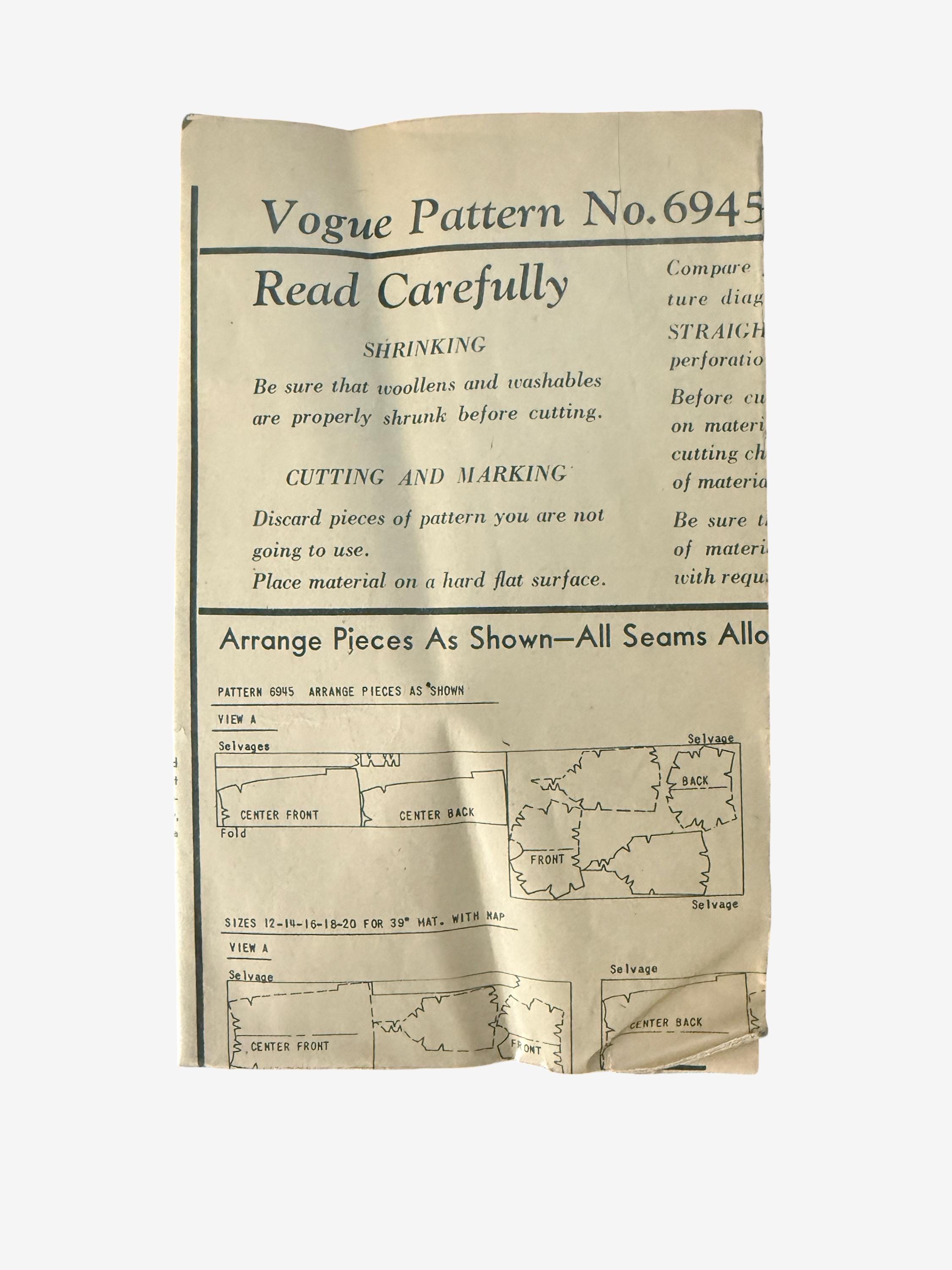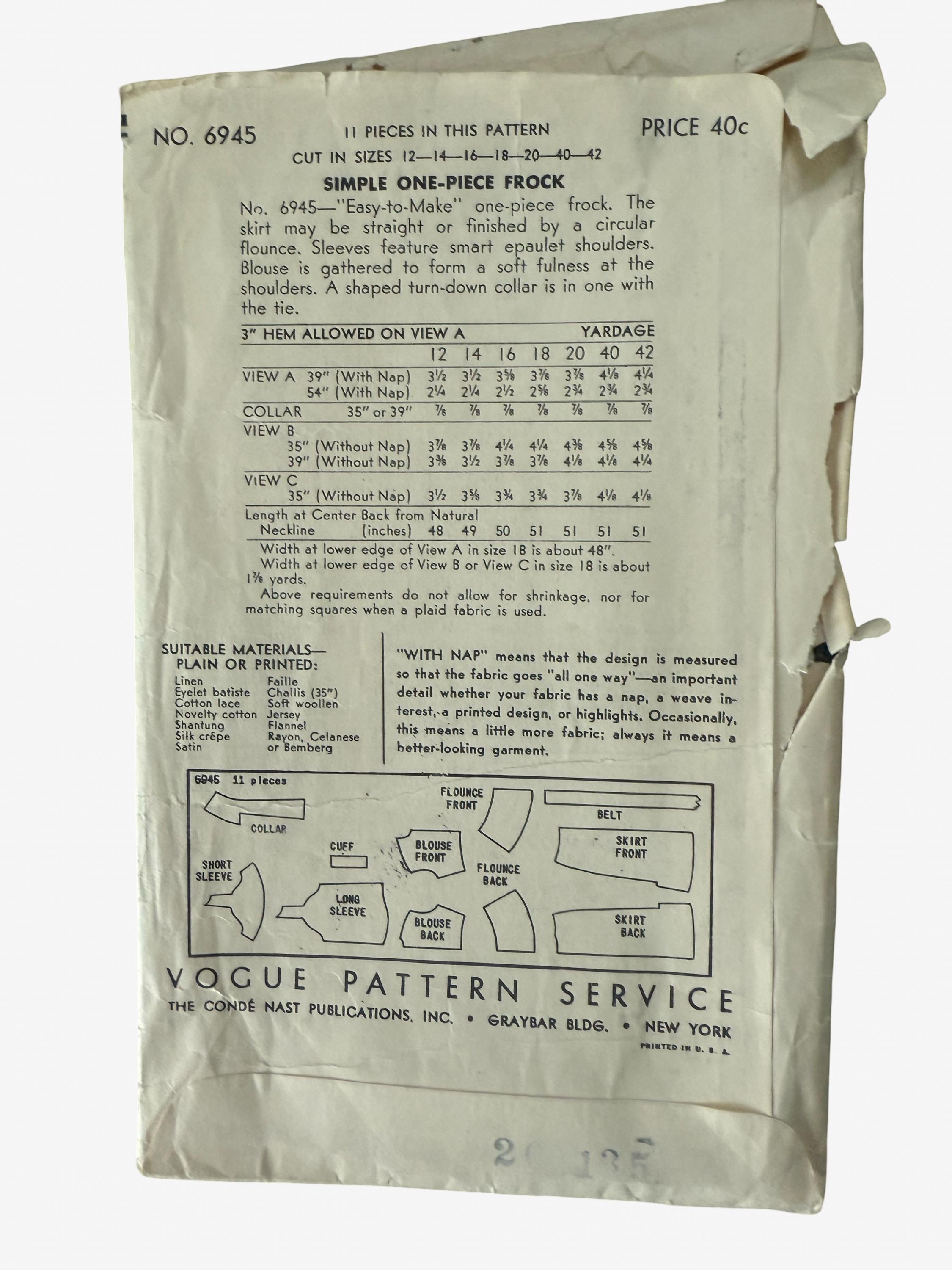 This vintage sewing pattern is for a "one-piece frock" from Vogue, numbered 6945, which dates to the late 1930s or early 1940s.