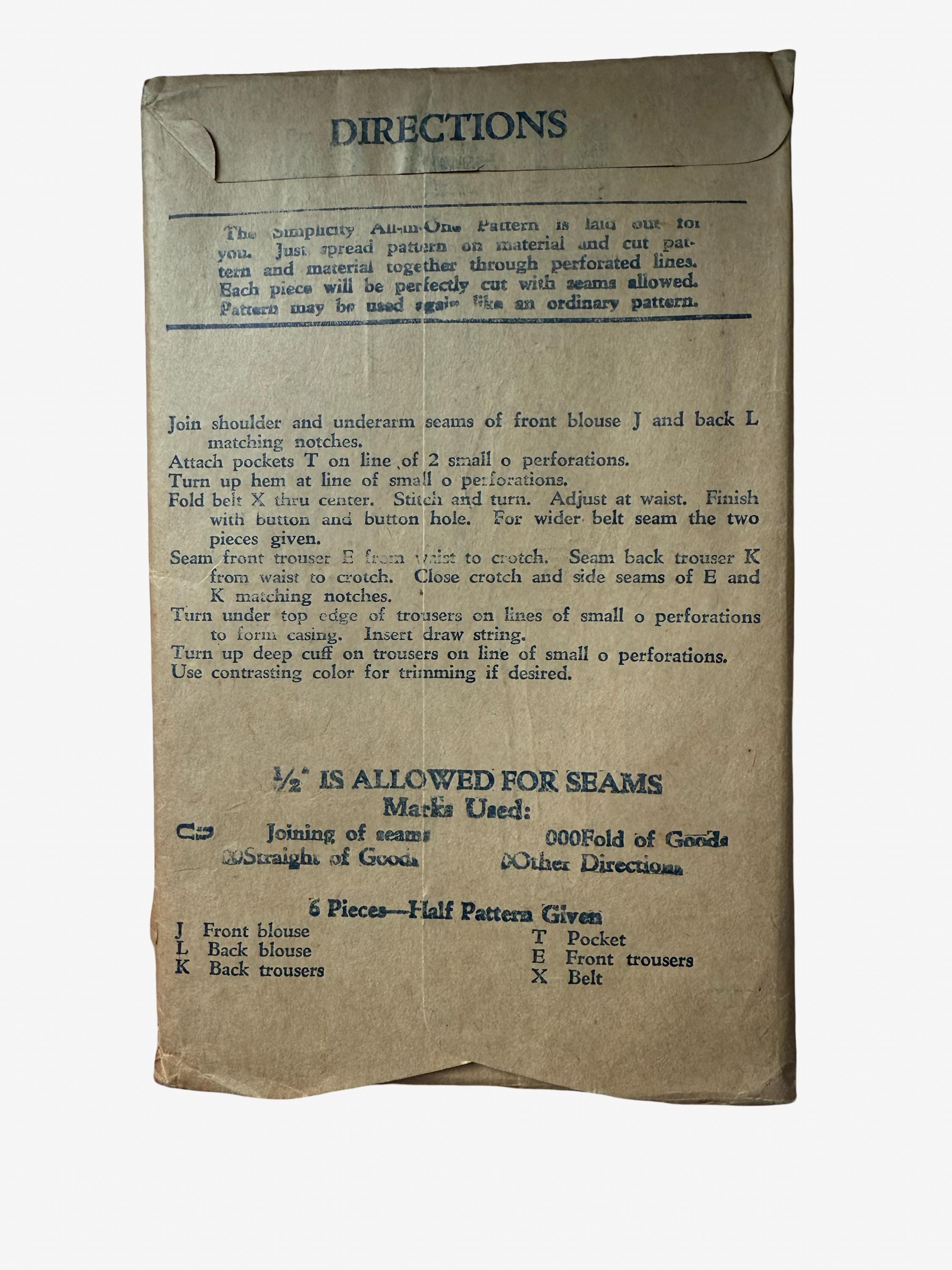 Rare 1920s Simplicity pattern for girl’s pajamas. The envelope says it is a size 12. As children were smaller in the 20s, a size 12 was a 30” bust and 27” waist.