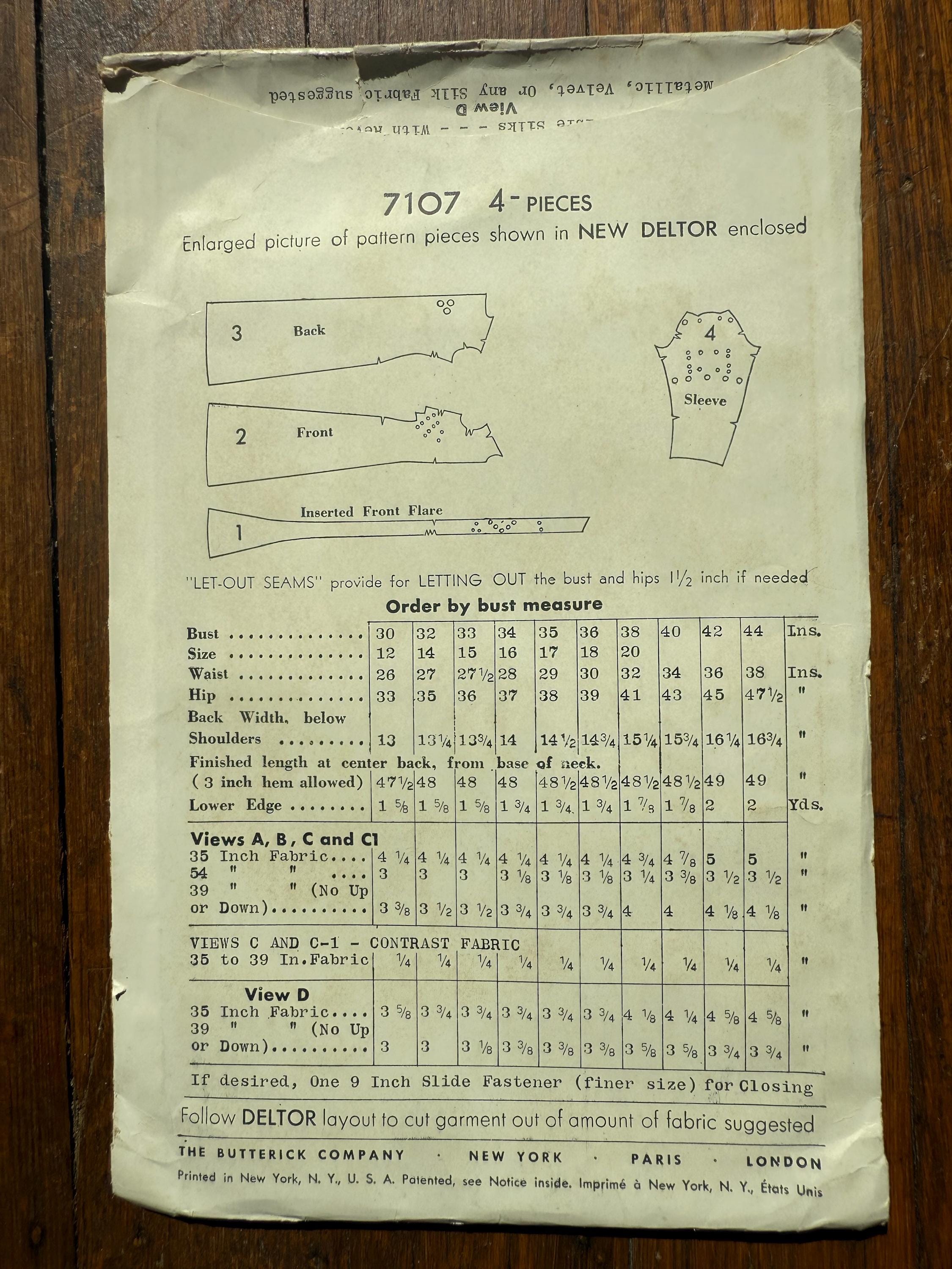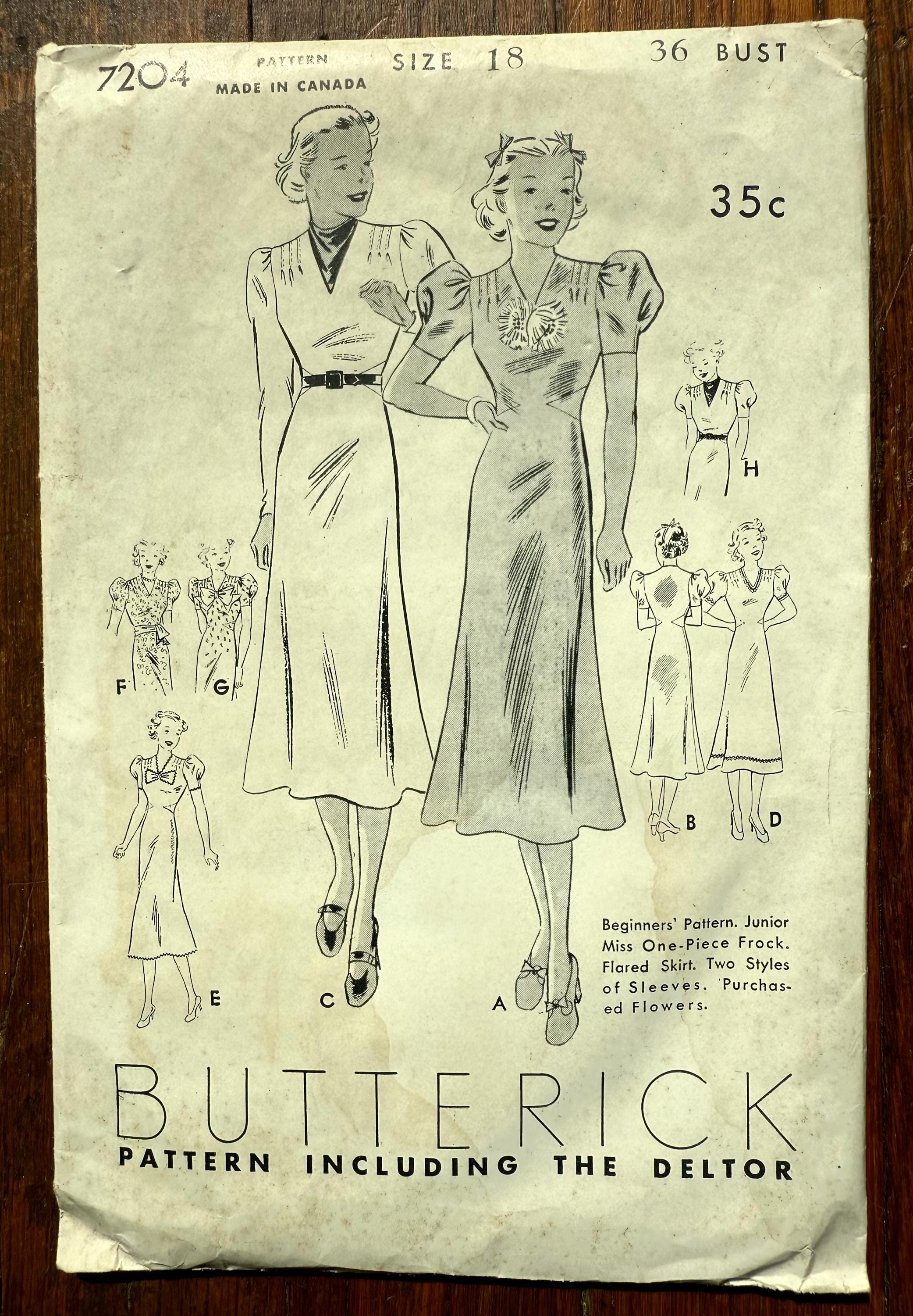 The pattern features a flared skirt and two styles of sleeves. The pattern includes 5 pieces plus the “Deltor” which is the term they used to mean the instruction guide.