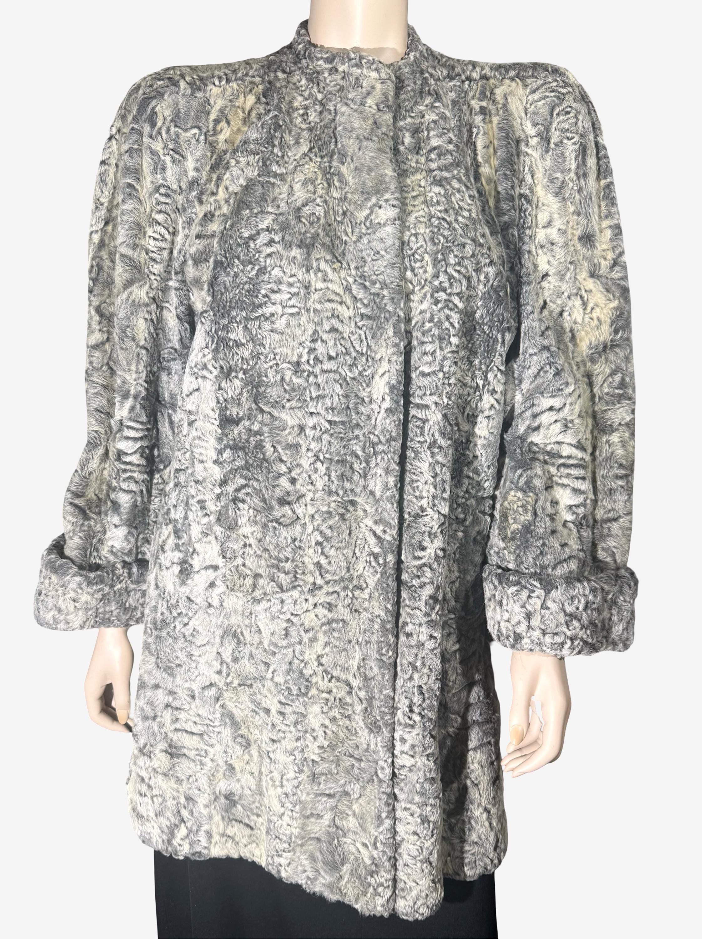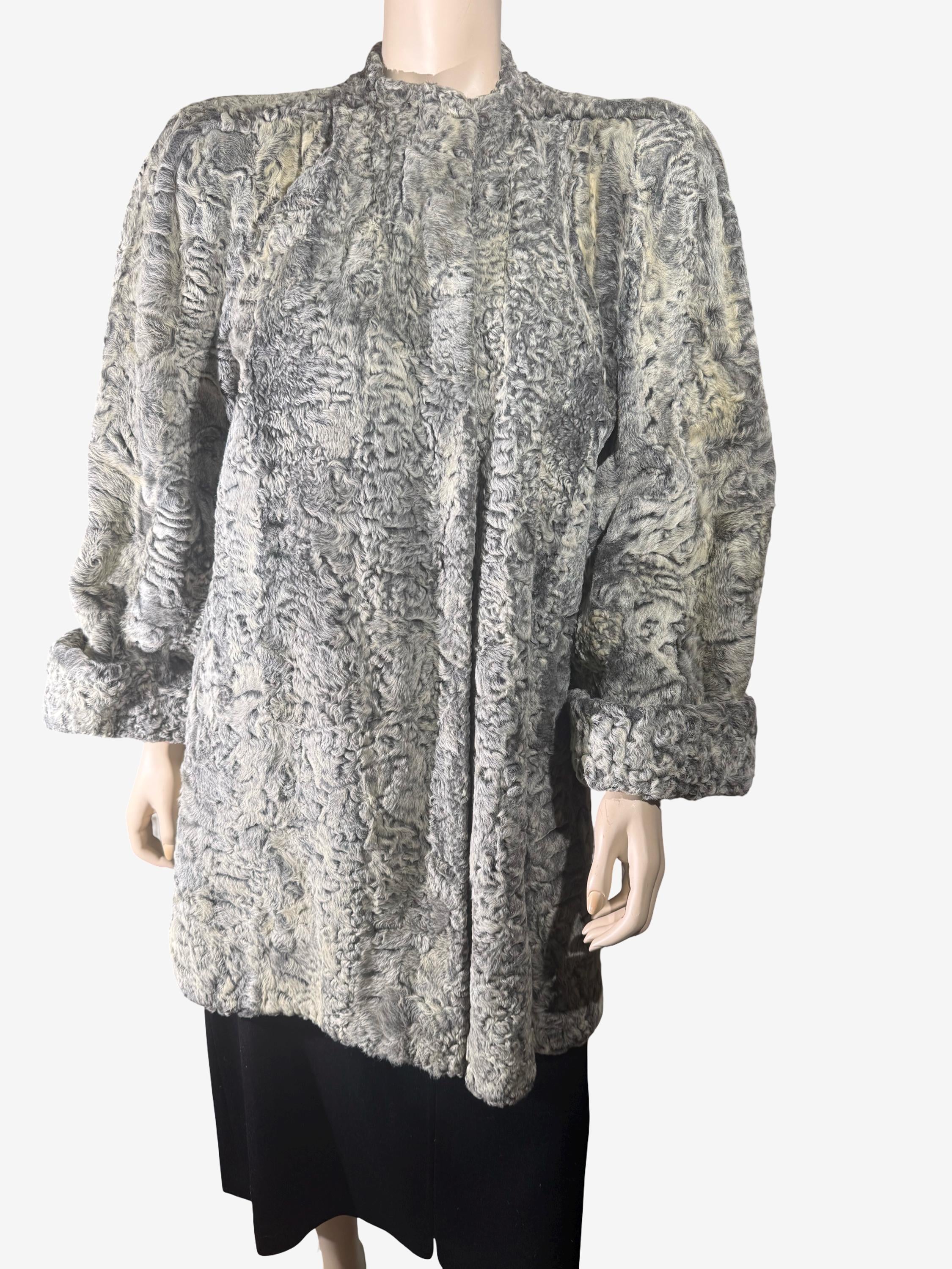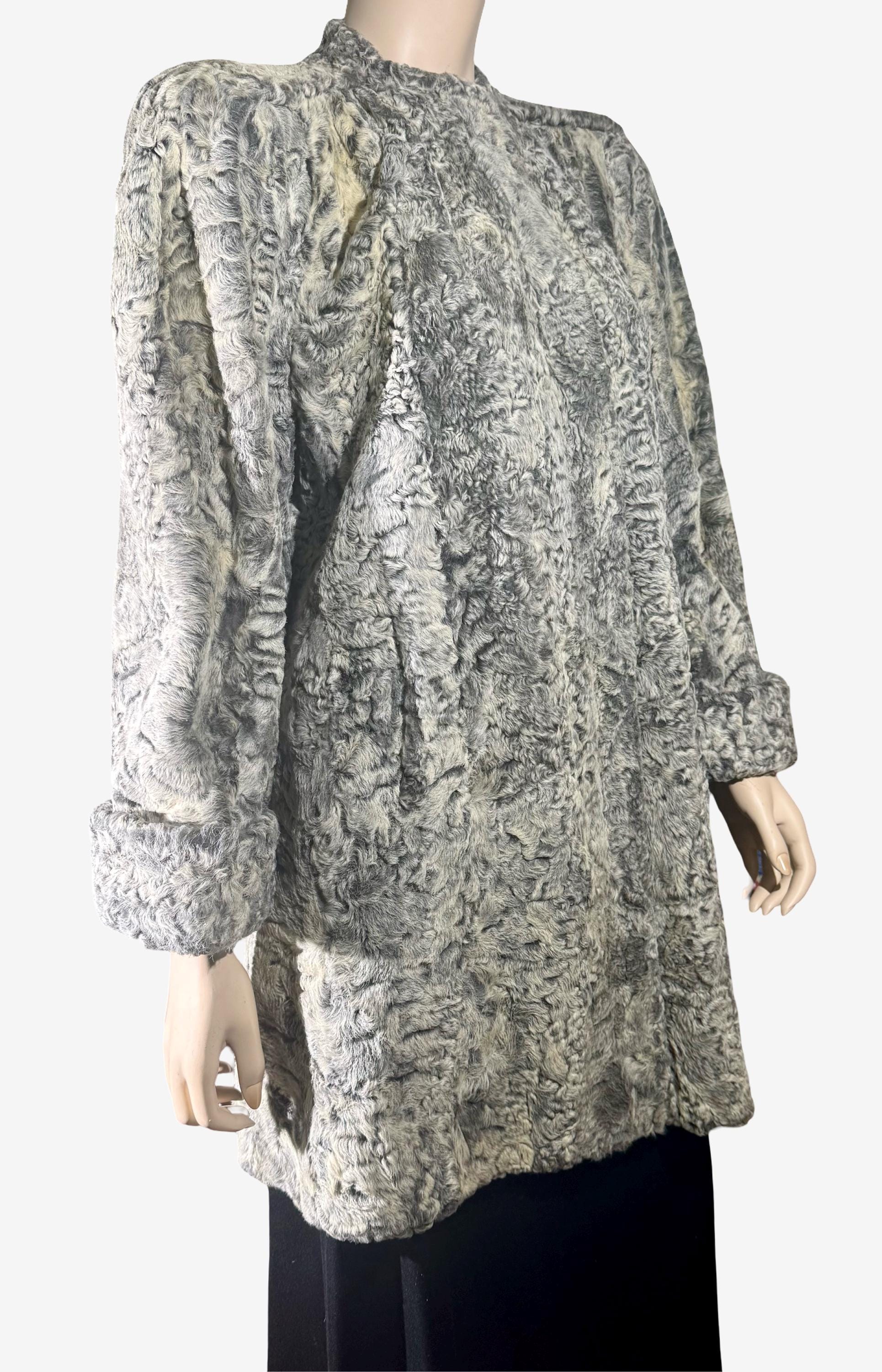 The color is a blend of silver and gray tones, which is also very rare to find. The coat has a long, loose fit slightly longer than a swing coat.