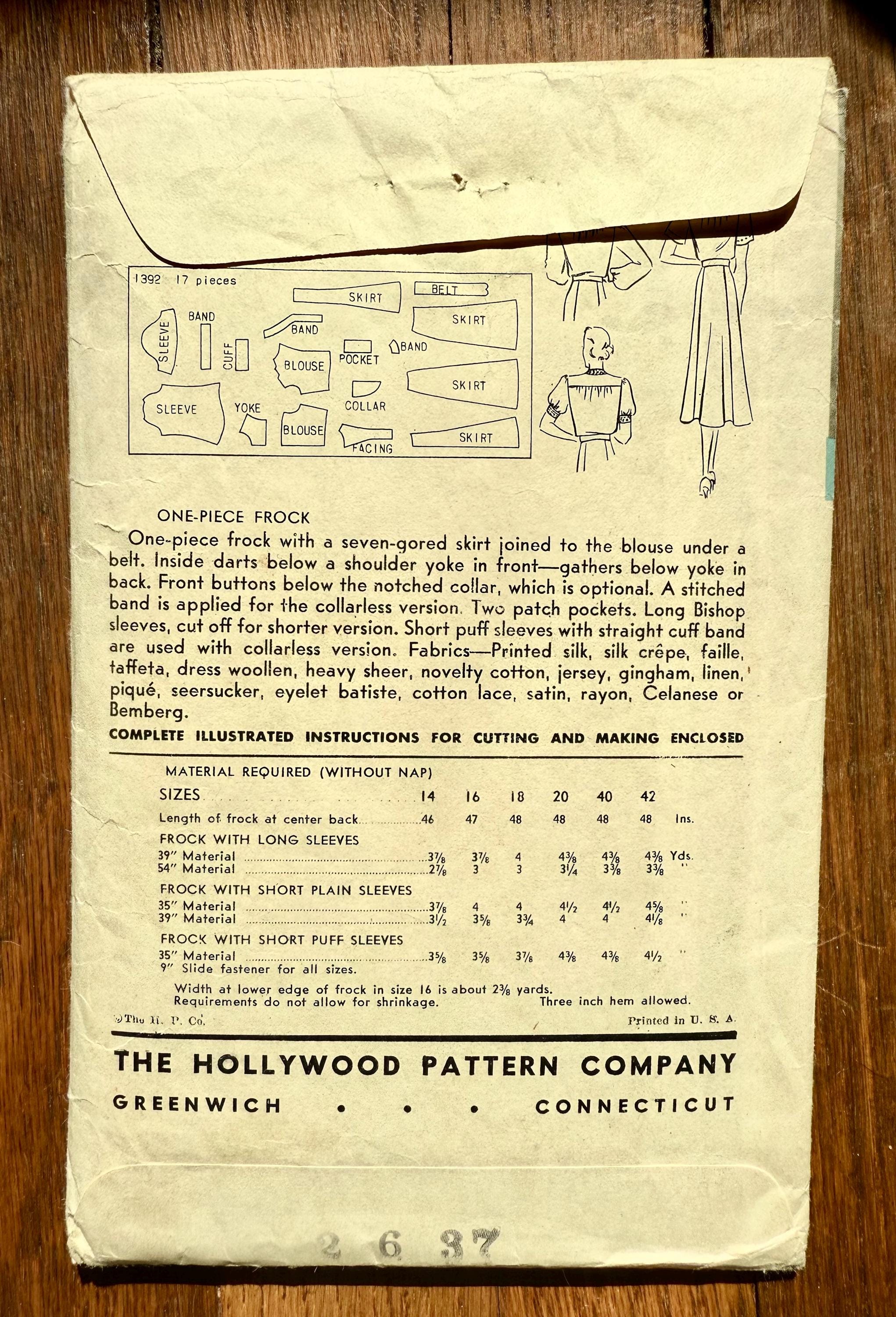 This is a vintage sewing pattern for a 1930s dress, Hollywood Pattern 1392, with a picture of actress Joan Bennett on the envelope.