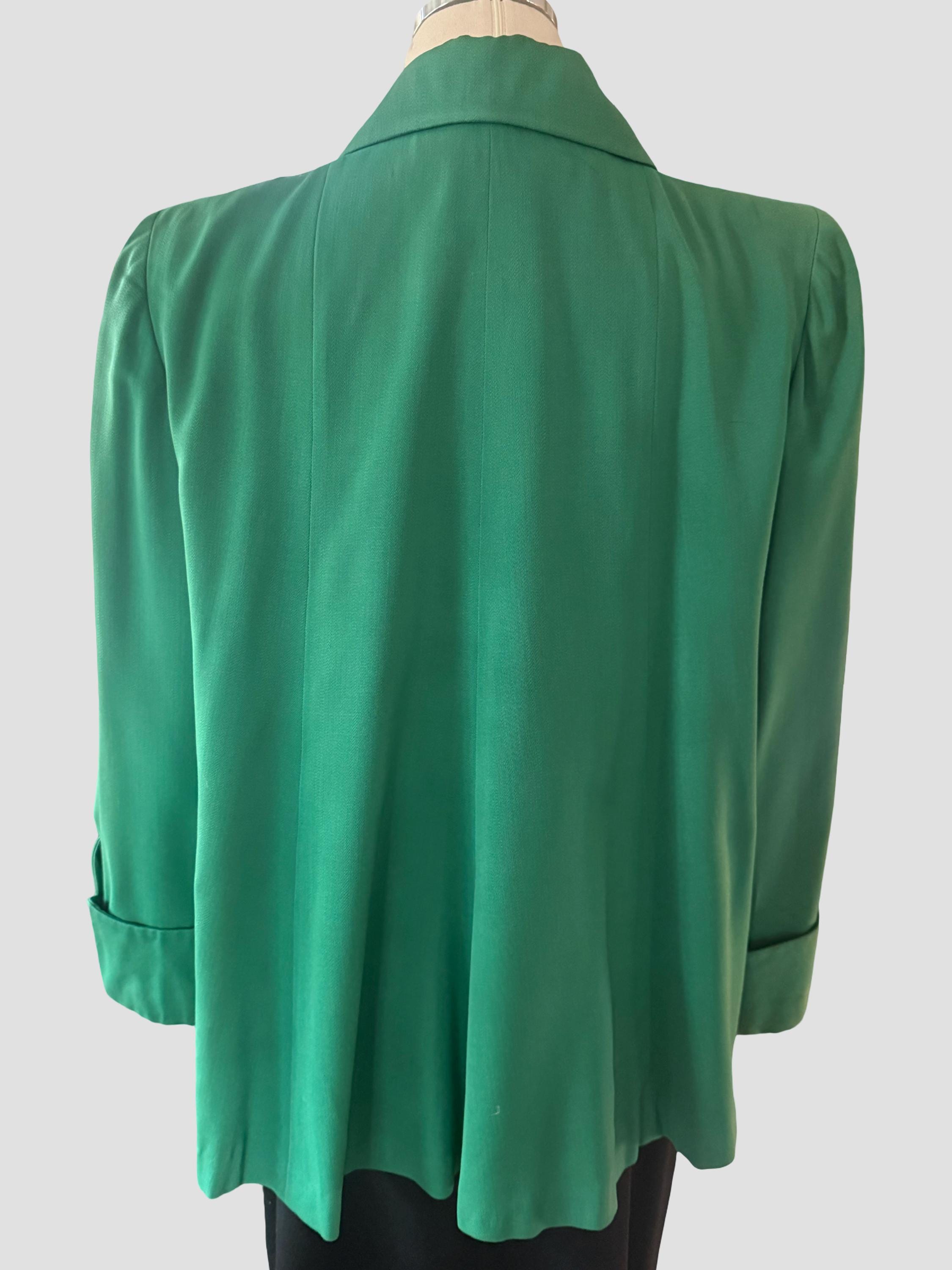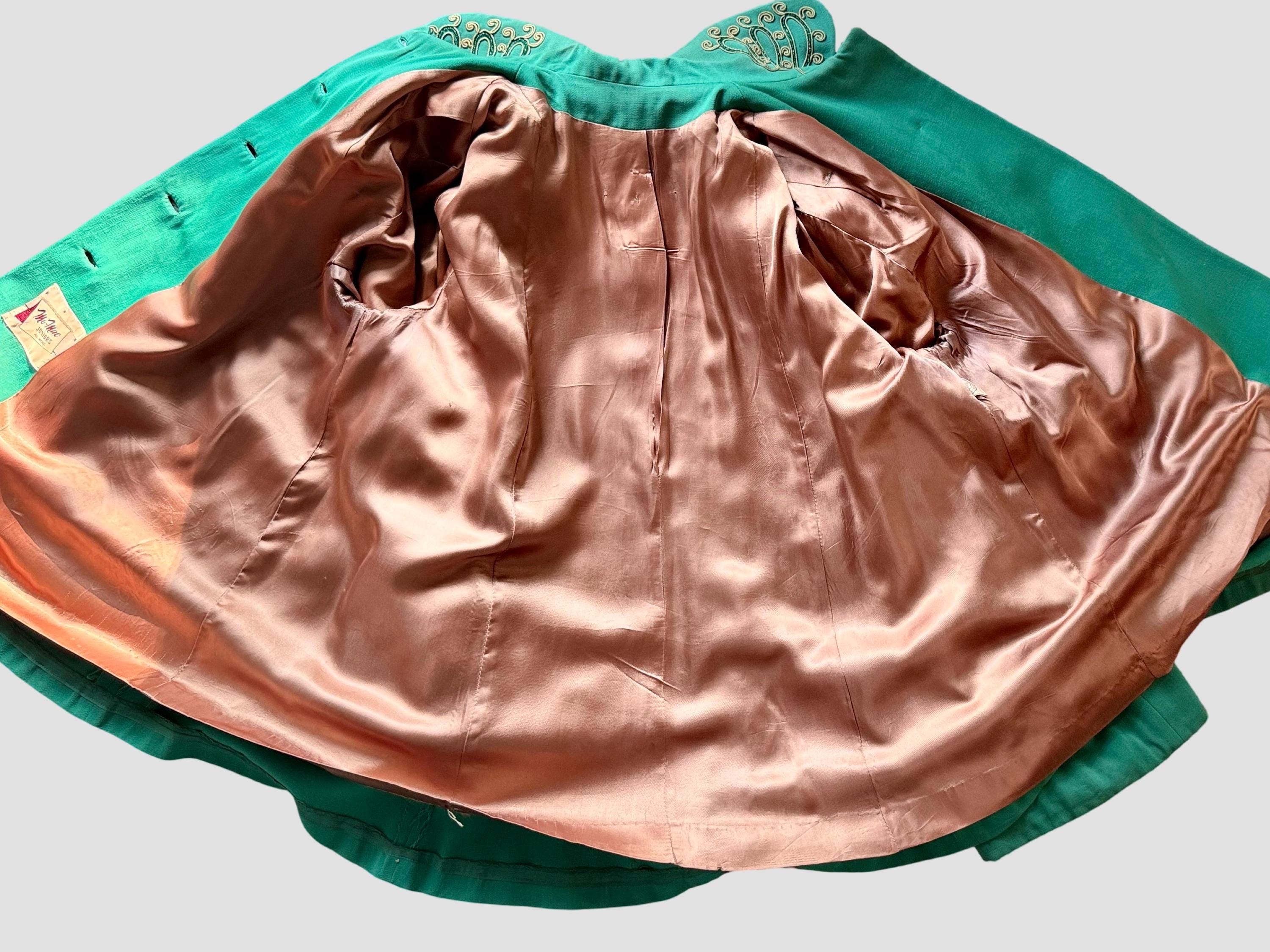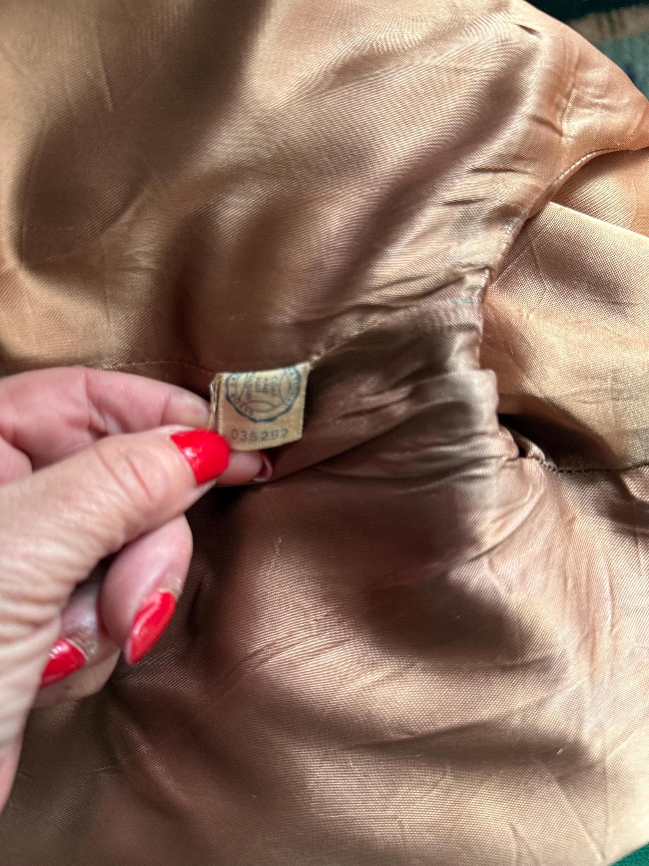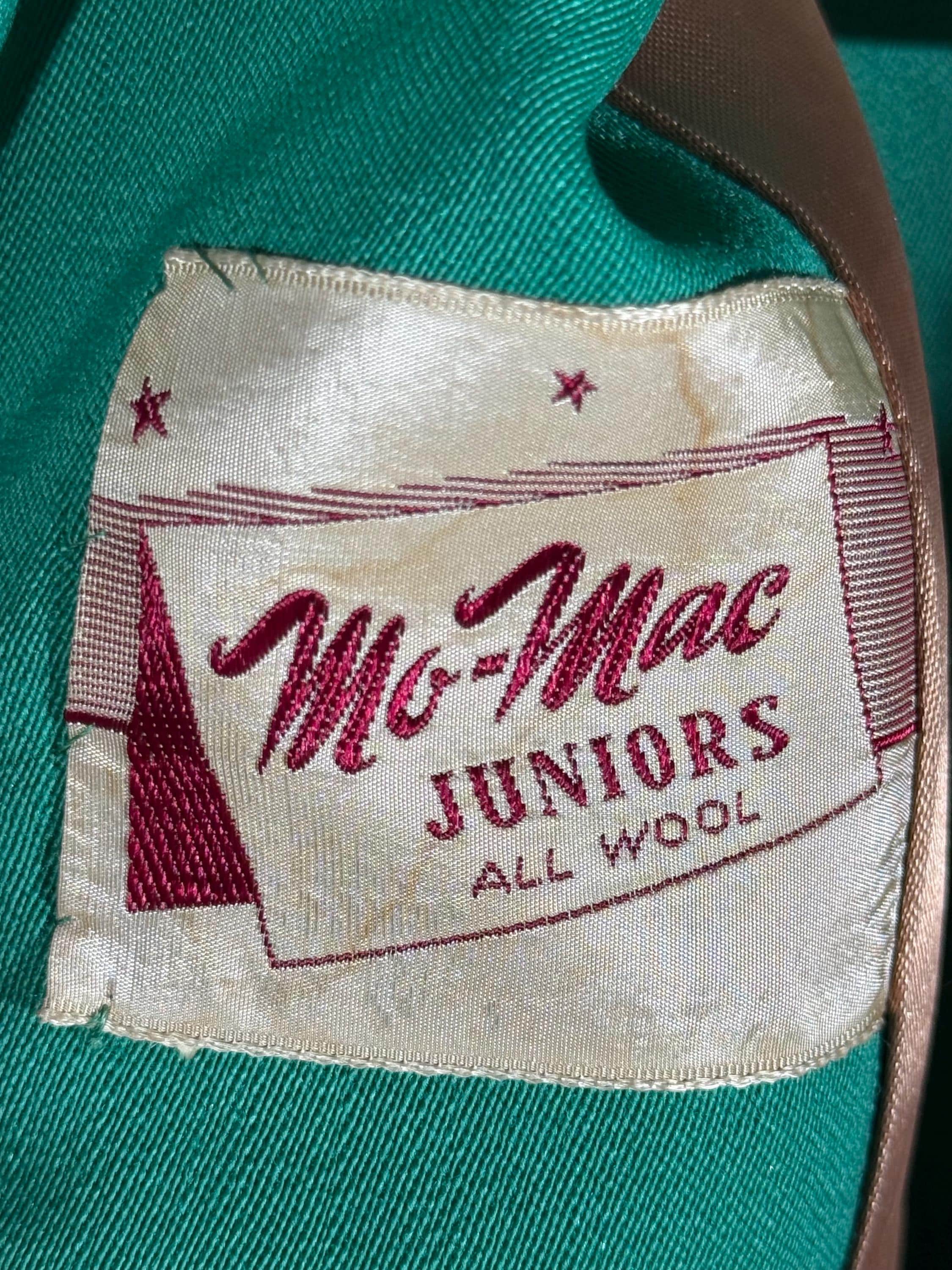 Fit and Fabric: The jacket has a slightly structured, boxy fit which flares on the bottom. This is typical of mid-century styles. The fabric has a subtle texture.