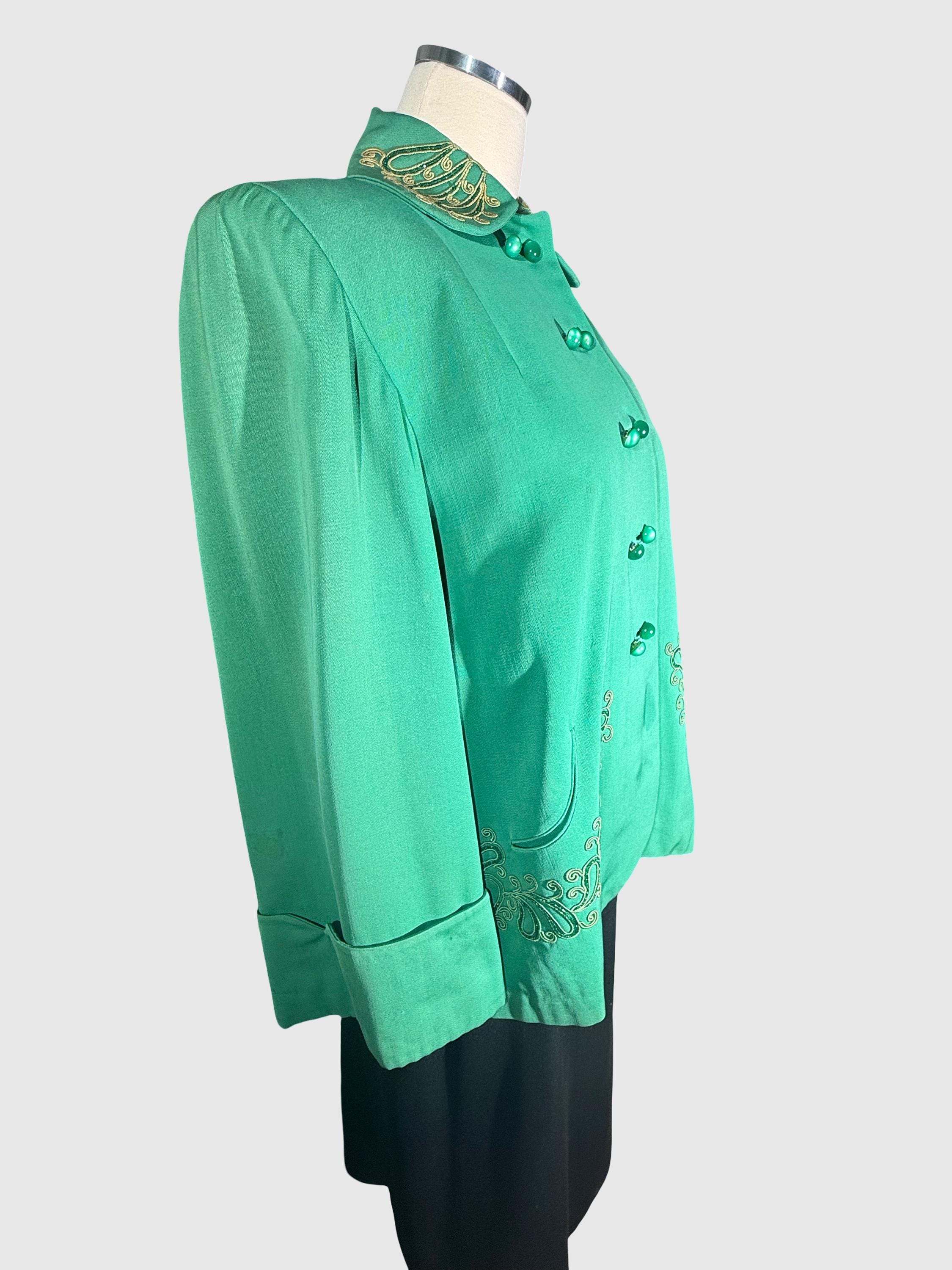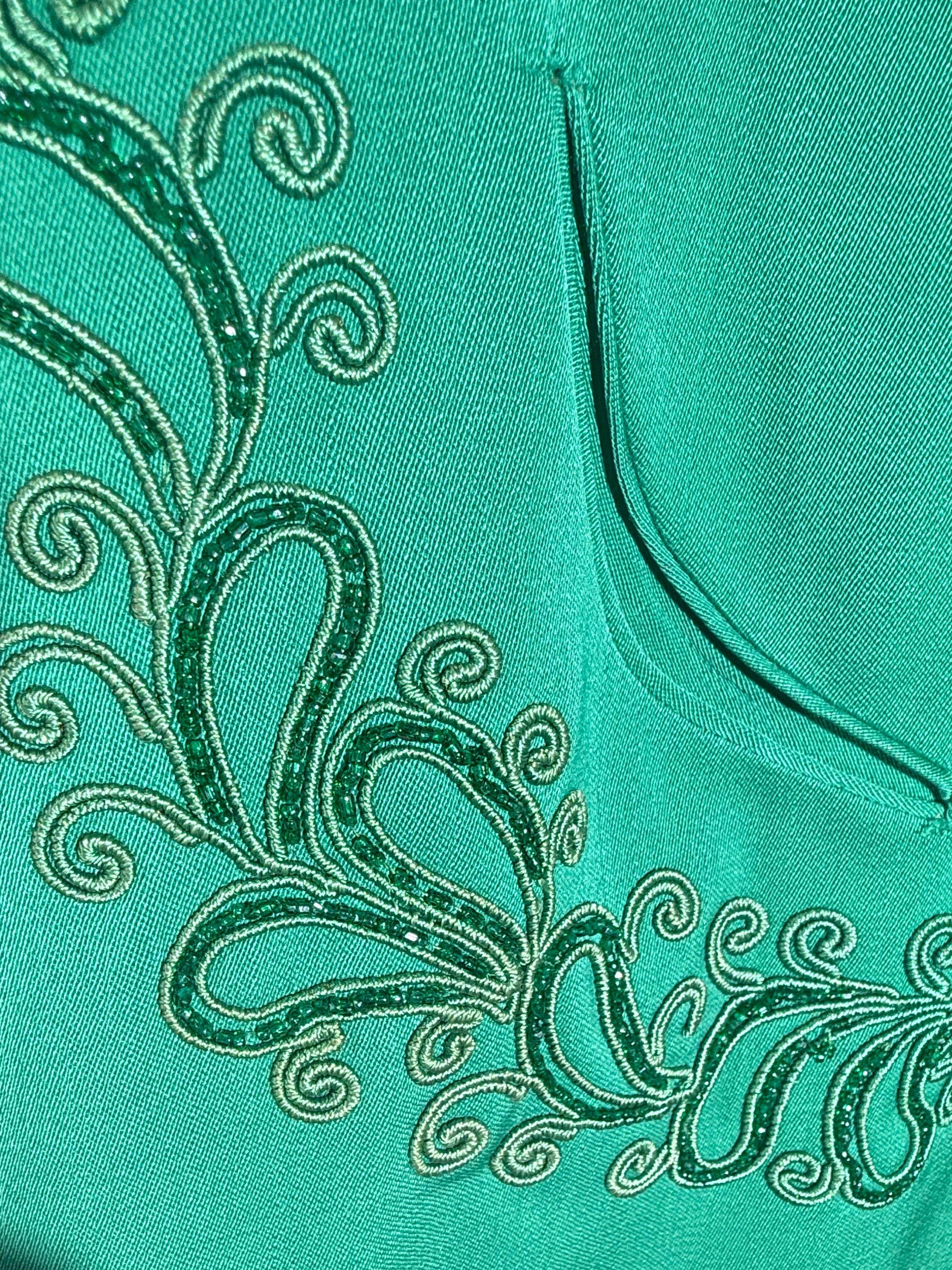Both the rounded collar and the two front pockets are embellished with intricate, light green colored embroidery in a swirling, scroll-like pattern and emerald green beading.