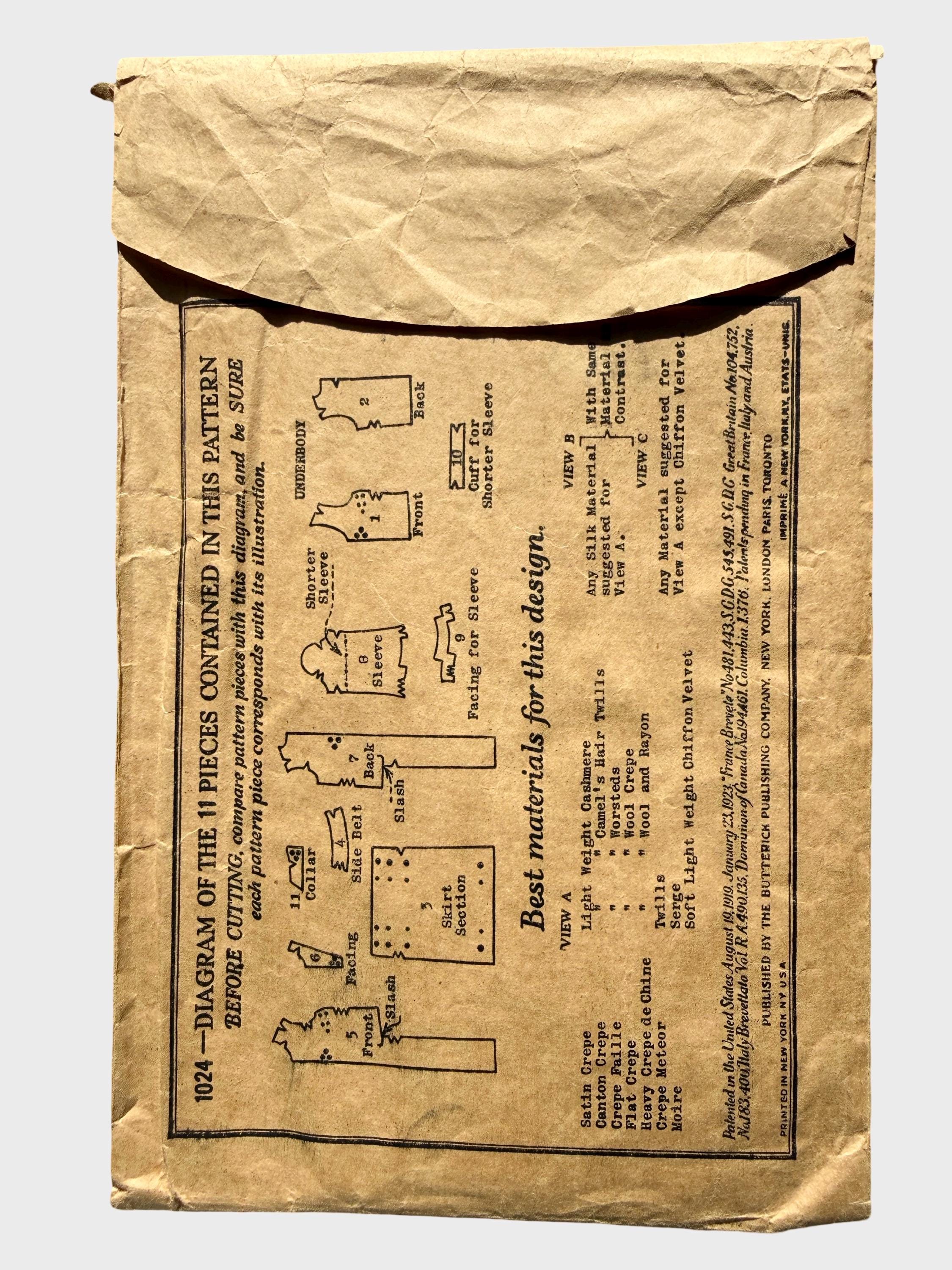 This is a vintage 1920s Butterick #1024 sewing pattern for a ladies' slip-over one-piece dress.