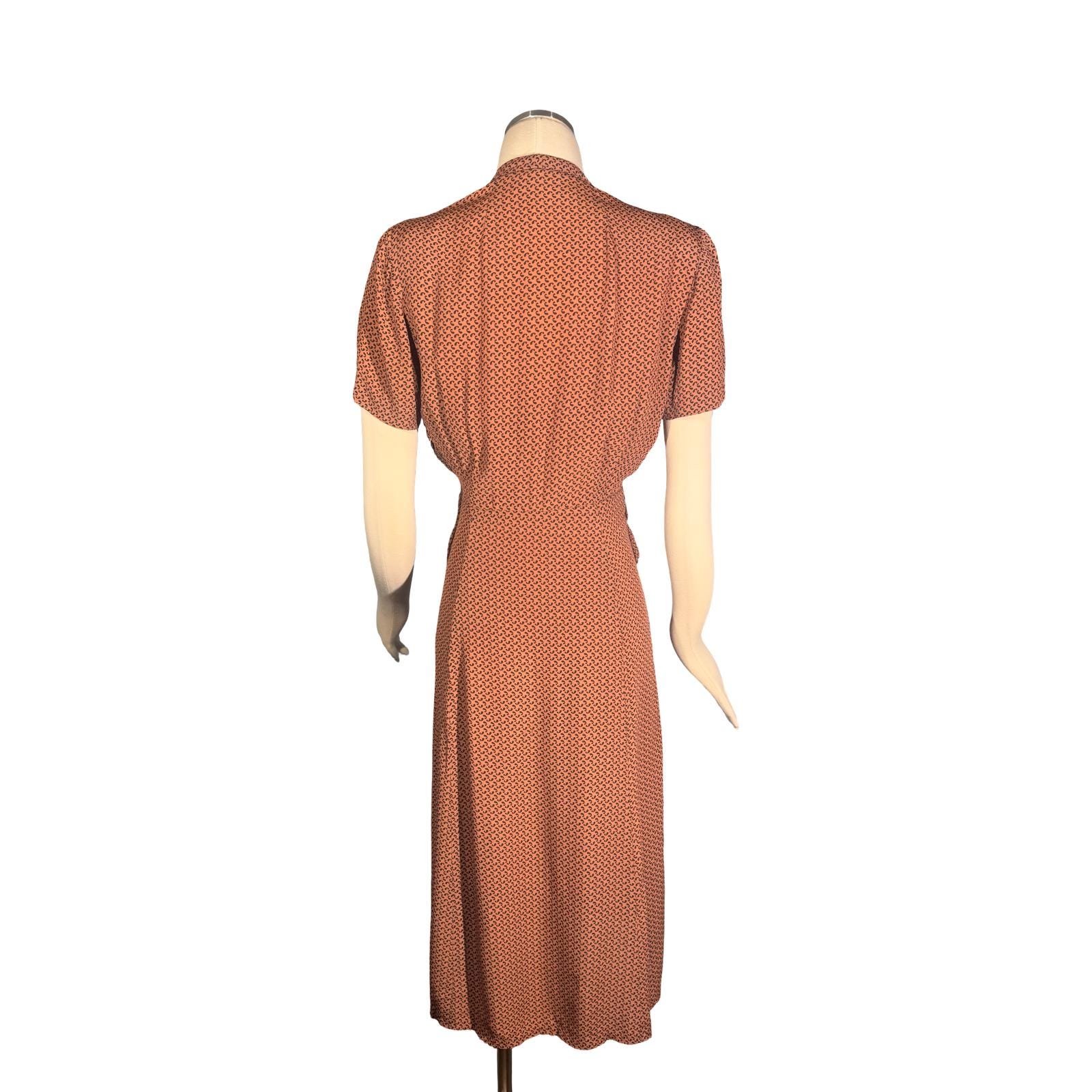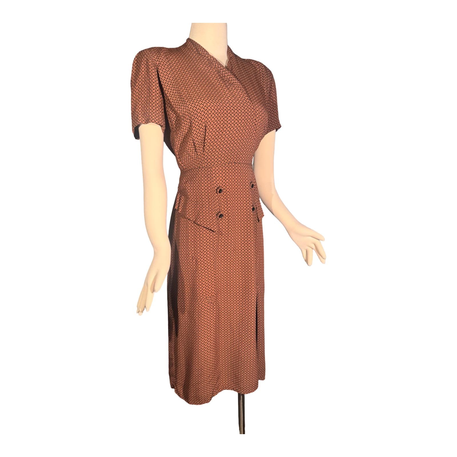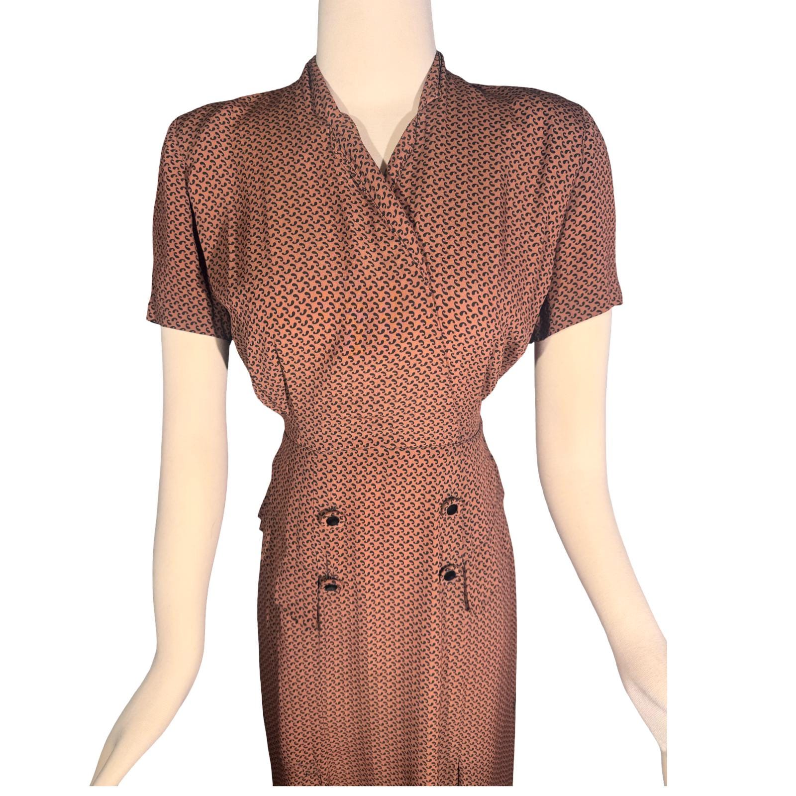 This vintage 1940s rayon dress features the classic 1940s "nipped-in" high waist and a knee-length A-line skirt.