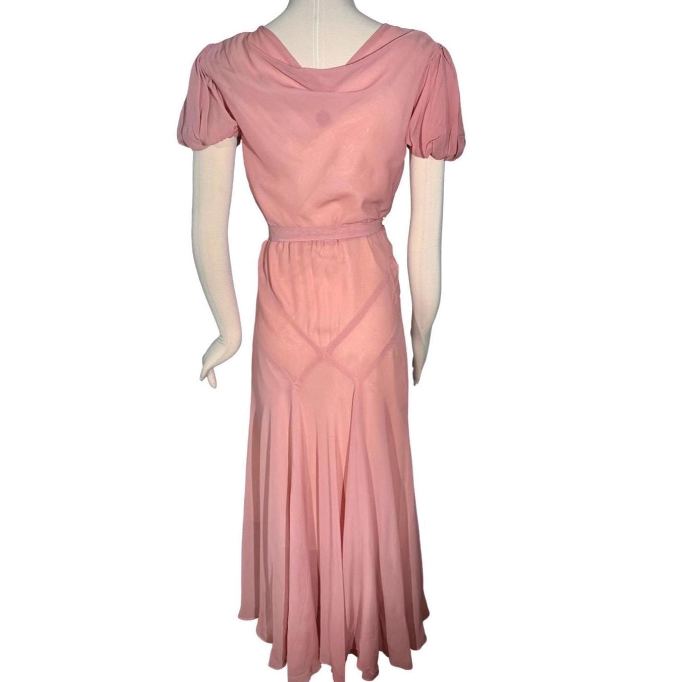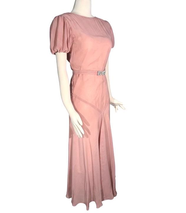 This 1930s evening dress is a is a sheer dusty rose pink silk chiffon.