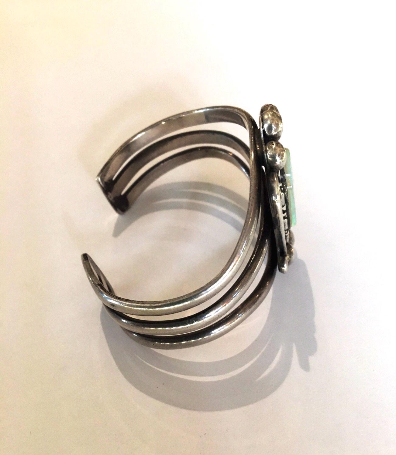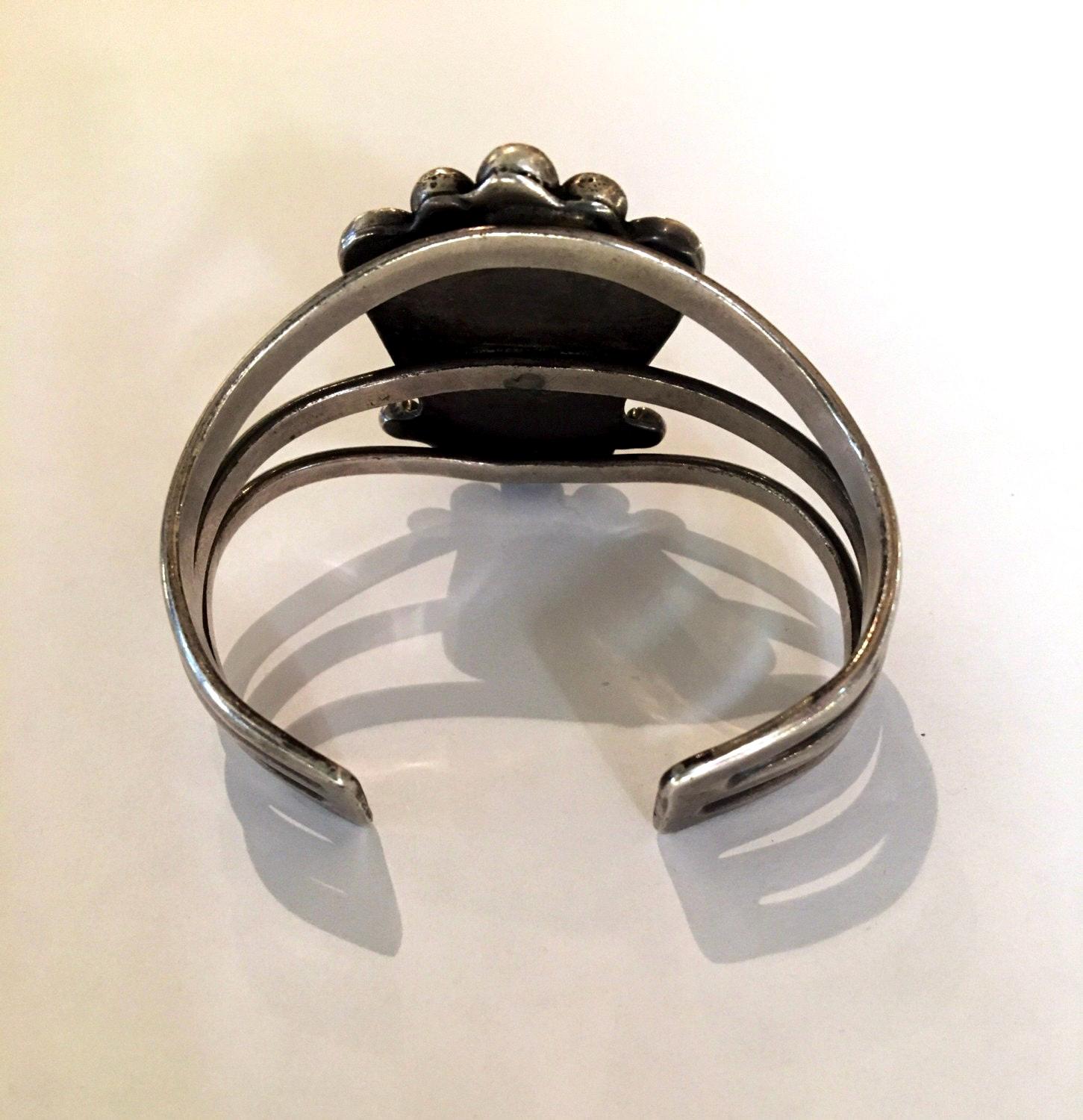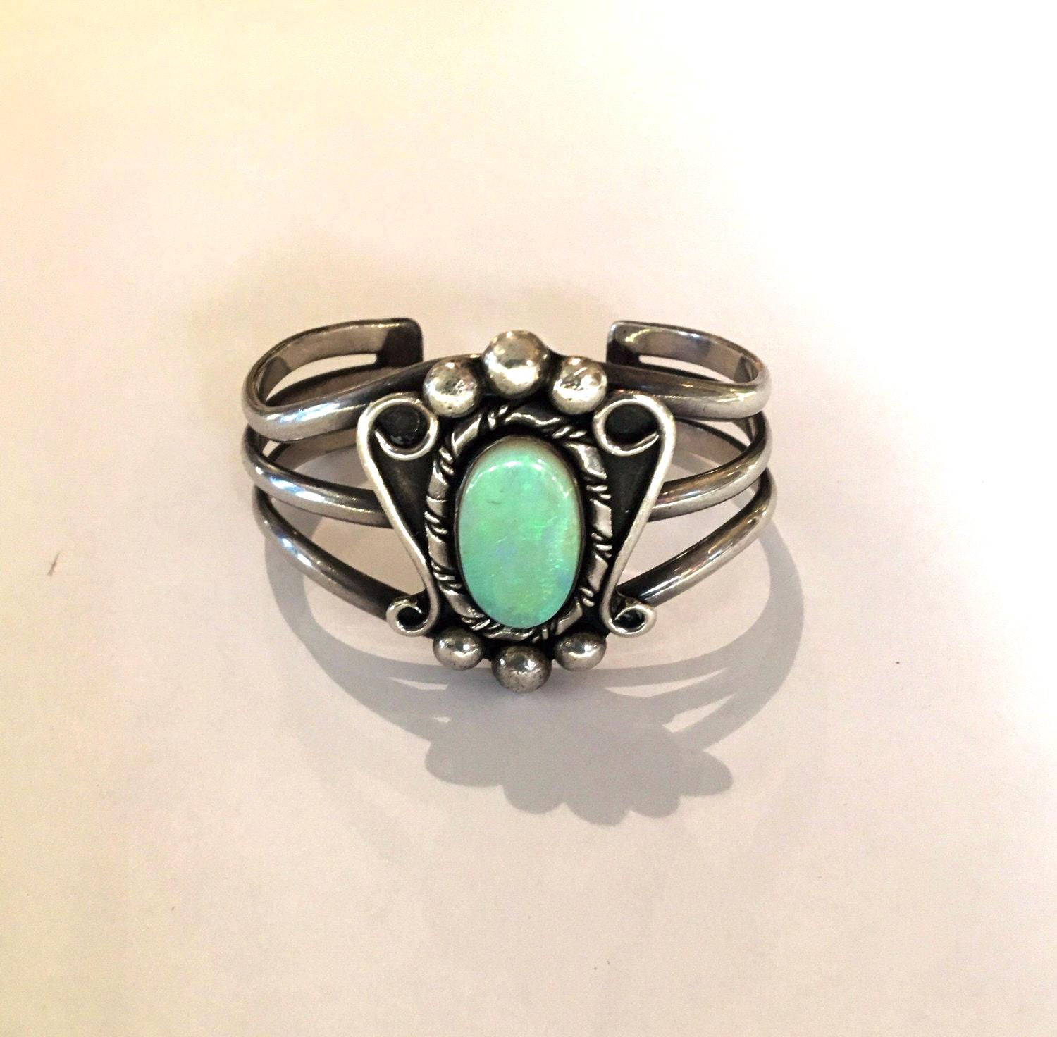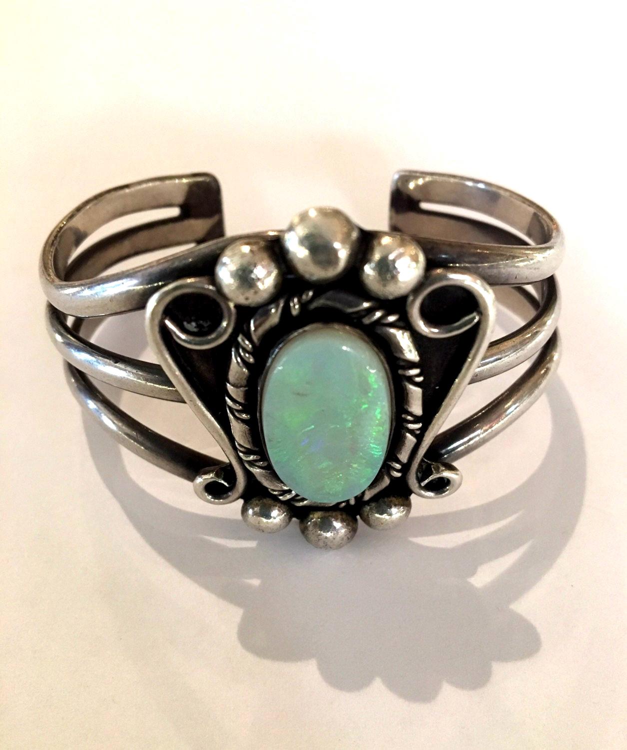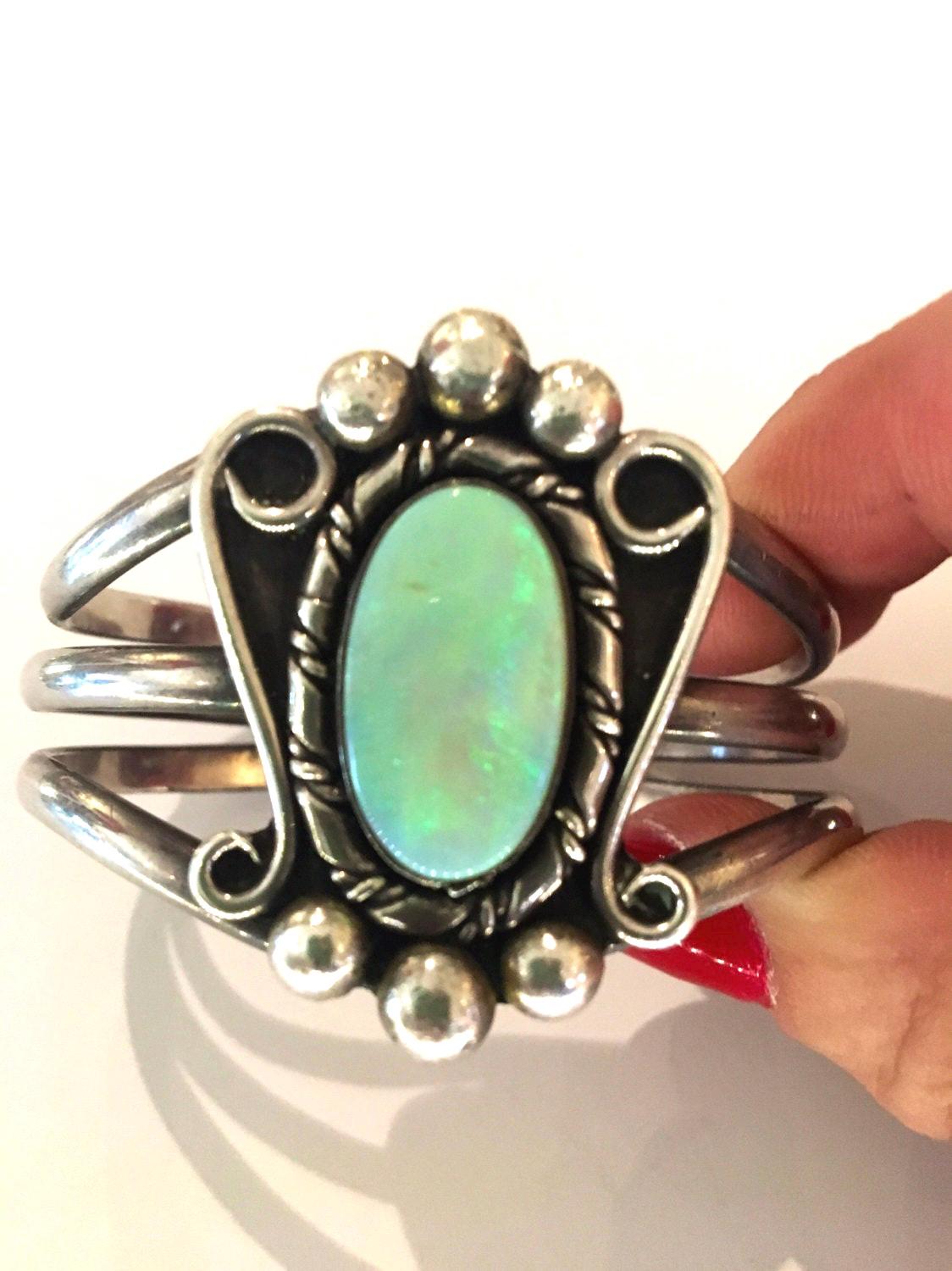 This is from my personal collection. This bracelet was made for me in the late 70s. The opal is amazing. Clear with no cracks or any issues. I was told by a jeweler that it is a "double" and an incredibly beautiful opal. The silver is clean with no scratches or dents. This piece was made for me in the 70s and I never wore it. I am rating this piece as being in EXCELLENT condition!
